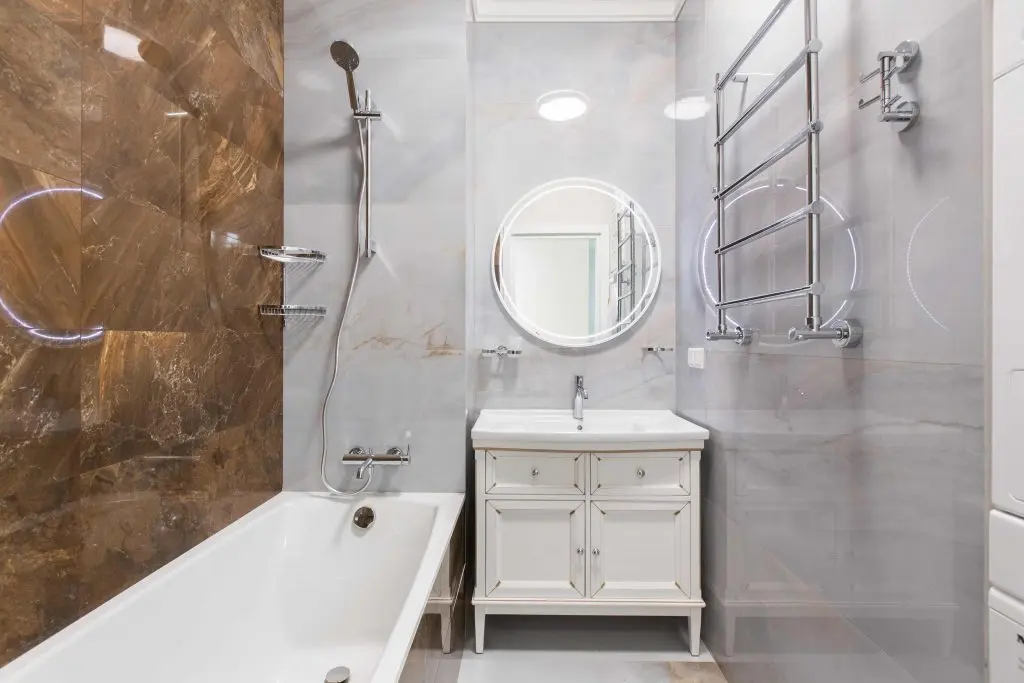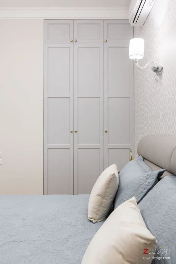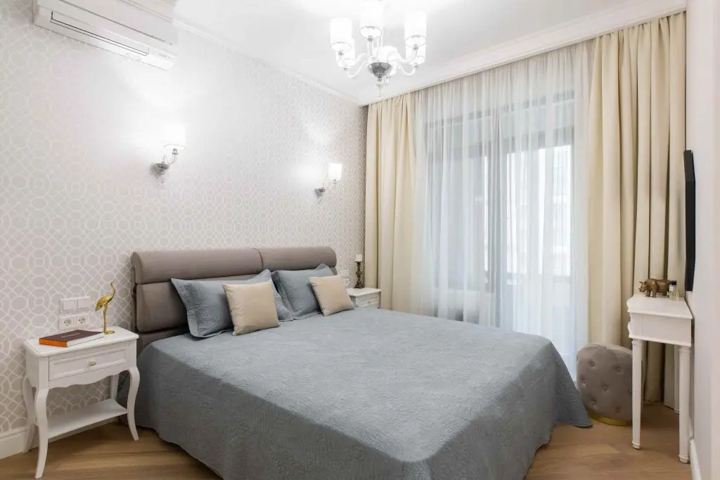 In dormitorul principal regasim un pat dublu modern ce are pe ambele parti 2 noptiere in stil clasic. Un dressing spatios si o zona de make-up au fost de asemenea integrate in acest spatiu nu foarte generos.