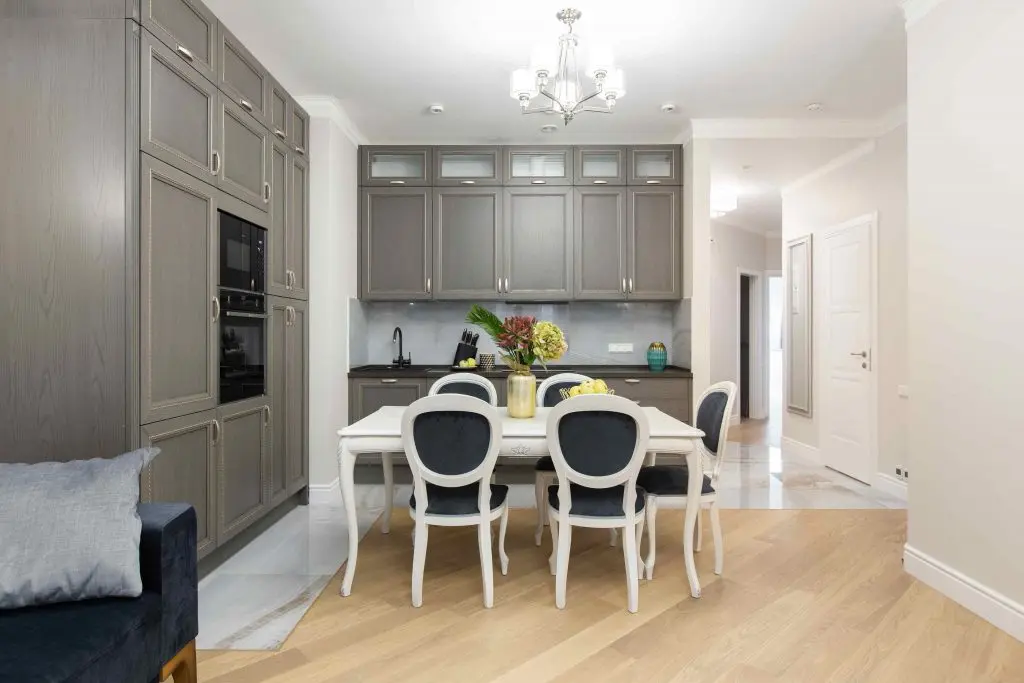 Pentru bucatarie s-a optat pentru un mobilier din lemn masiv facut pe comanda, in care au fost integrate toate electrocasnicele, inclusiv figiderul. Zona de dining a fost delimitata vizual la nivelul pardoselii, si este alcatuita dintr-o masa, tot din lemn masiv, la care se pot pune maxim 6 scaune.