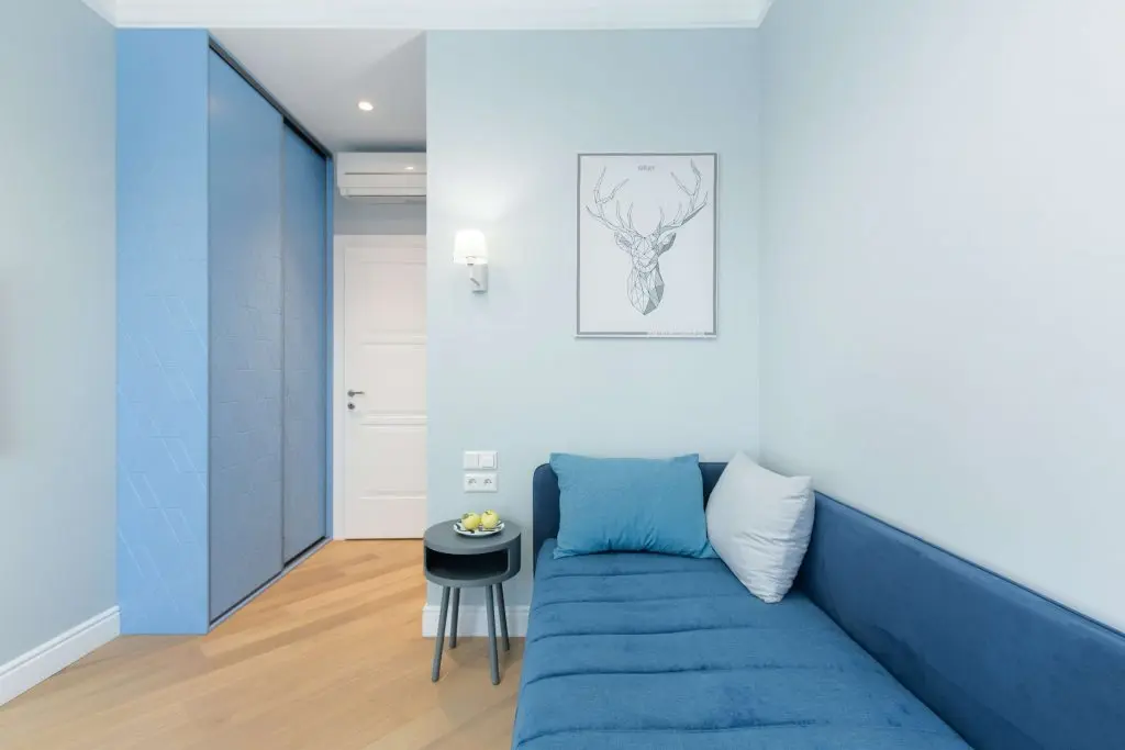Chiar daca din punct de vedere cromatic amenajarea se bazeaza doar pe nuante de albastru, datorita unui iluminat adecvat si a micilor detalii decorative, designerii au reusit sa obtina un decor luminos si unitar in care monotonia nu isi are locul.