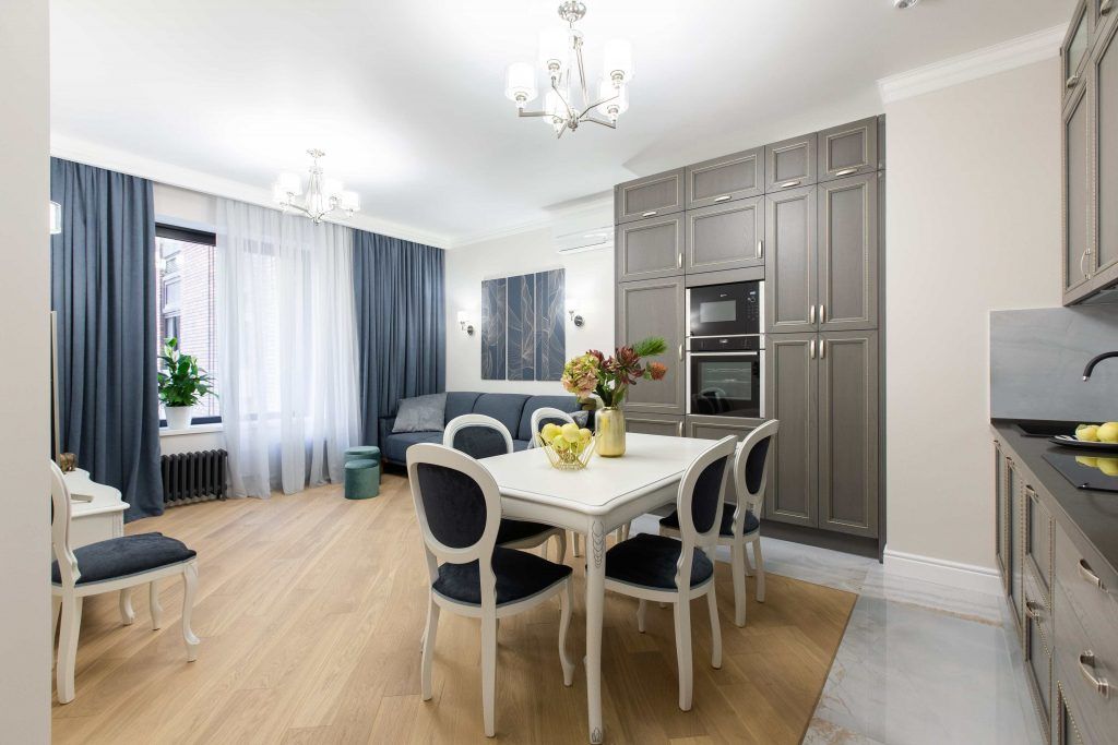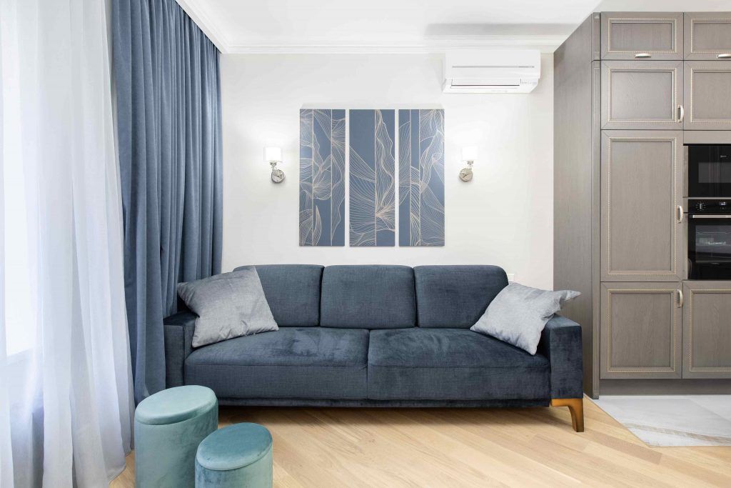 In living, designerii de la Zdesign, au ales o canapea extensibila pe care au asortat-o atat cu draperiile si tabloul abstract de deasupra, cat si cu tapiteria scaunelor din zona de dining.