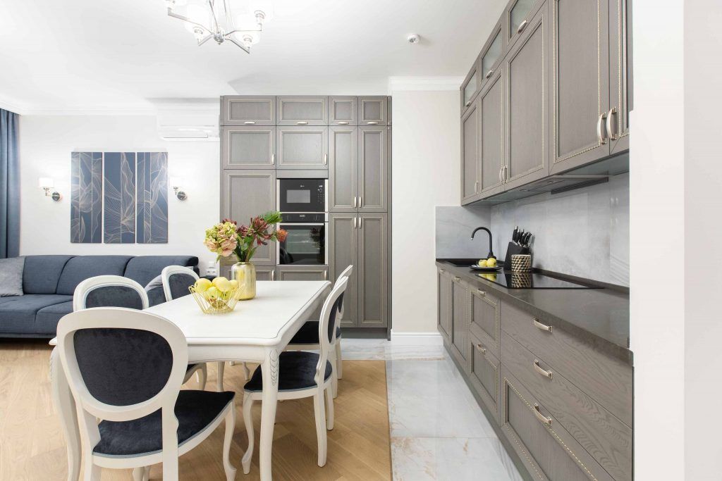 O buna parte din suprafata apartamentului este ocupata de zona de zi, zona ce include atat livingul cat si bucataria. Putem spune ca este principalul punct de atractie al acestei amenajari.