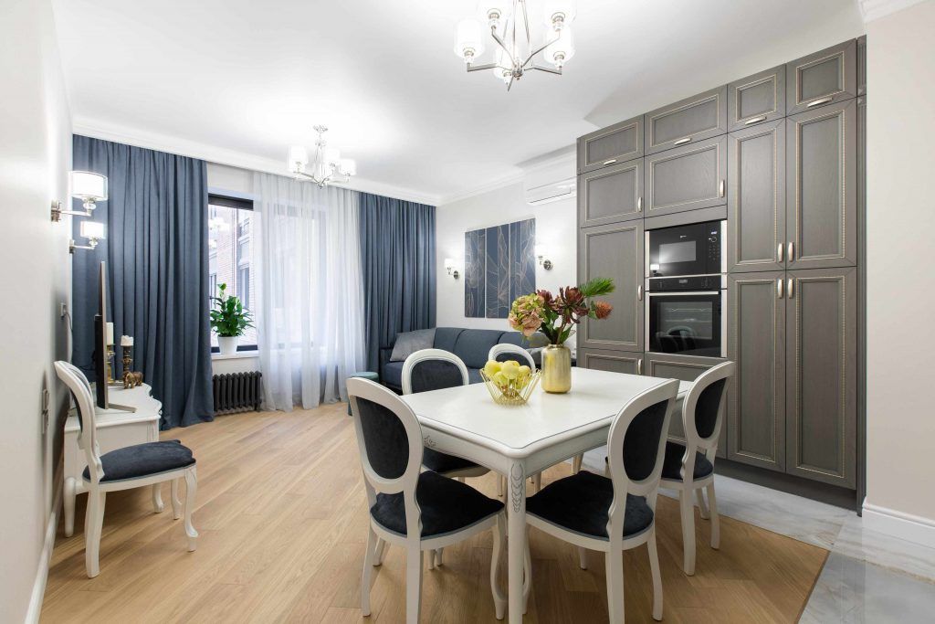 Pentru bucatarie s-a optat pentru un mobilier din lemn masiv facut pe comanda, in care au fost integrate toate electrocasnicele, inclusiv figiderul. Zona de dining a fost delimitata vizual la nivelul pardoselii, si este alcatuita dintr-o masa, tot din lemn masiv, la care se pot pune maxim 6 scaune.