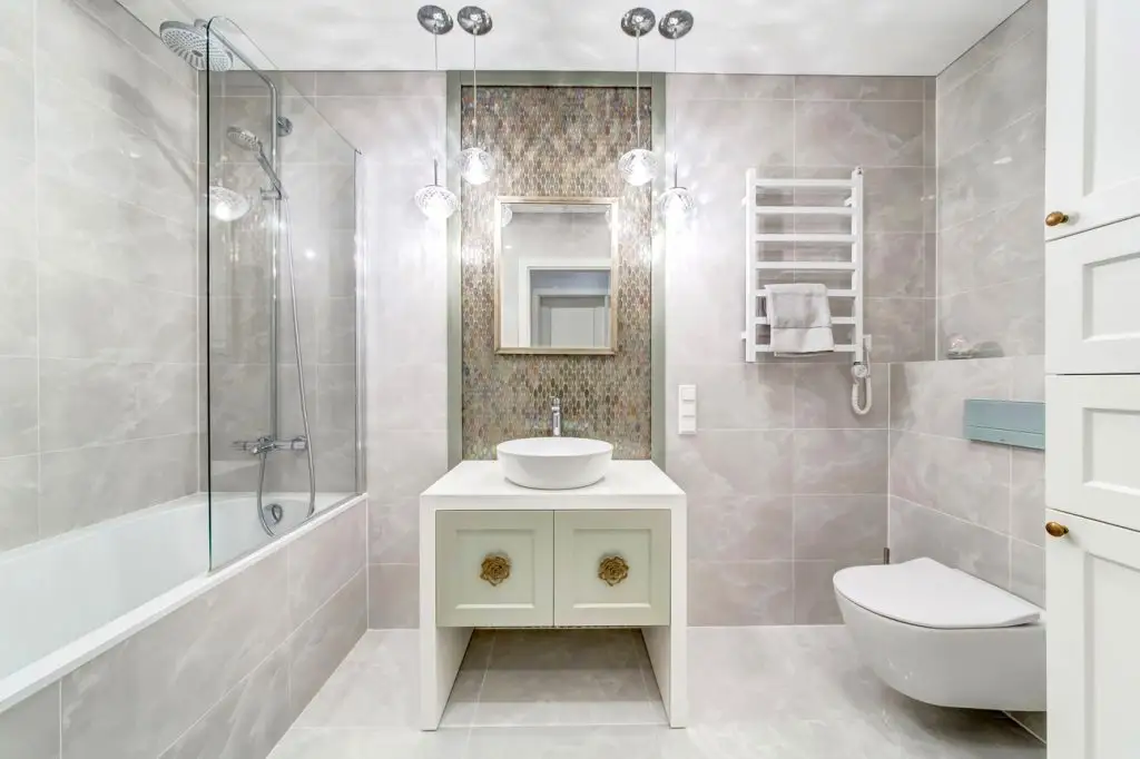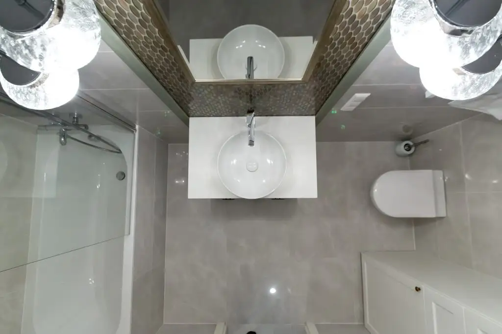 Baia primeste o atentie deosebita in ceea ce priveste decorarea murala si componentele sanitare. Vorbim in acest caz de un lavoar pe blat, un mobilier cu design elegant, mozaic metalic si accesorii de iluminat moderne. Sticla si placile de gresie si faianta in nuante de gri deschis, maresc incaperea si aduc un aer proaspat si multa luminozitate camerei.