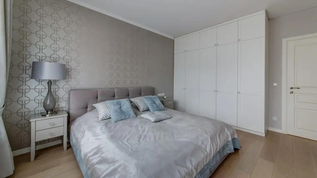 Dormitorul matrimonial se prezinta futurist si asta datorita tapetului satinat cu pattern geometric reliefat. Ideea de satin se pastreaza si in accesoriile textile cu care este prevazut patul dublu, pozitionat central, iar cu ajutorul veiozei, noptierei, fotoliului si dressing-ului, cele doua stiluri, clasic si modern, se imbina armonios si de aceasta data.