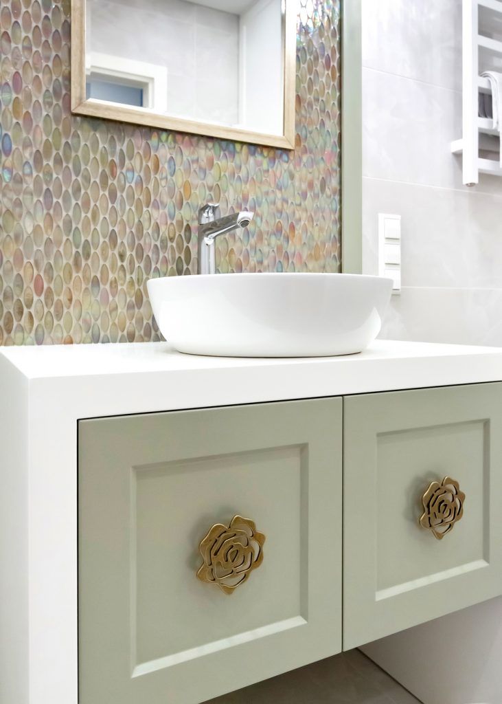 Baia primeste o atentie deosebita in ceea ce priveste decorarea murala si componentele sanitare. Vorbim in acest caz de un lavoar pe blat, un mobilier cu design elegant, mozaic metalic si accesorii de iluminat moderne. Sticla si placile de gresie si faianta in nuante de gri deschis, maresc incaperea si aduc un aer proaspat si multa luminozitate camerei.