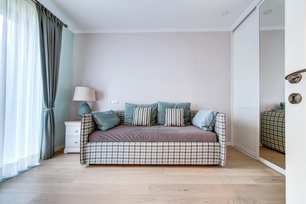 Pentru dormitorul cu dimensiuni mai reduse, se alege o canapea extensibila, o comoda si un dressing, totul pentru maximizarea spatiului si a confortului. Patternul geometric al canapelei, cat si designul noptierei si al comodei, aduc in discutie o imagine vintage, imagine ce se continua cu o veioza moderna si o masuta de cafea abstracta.