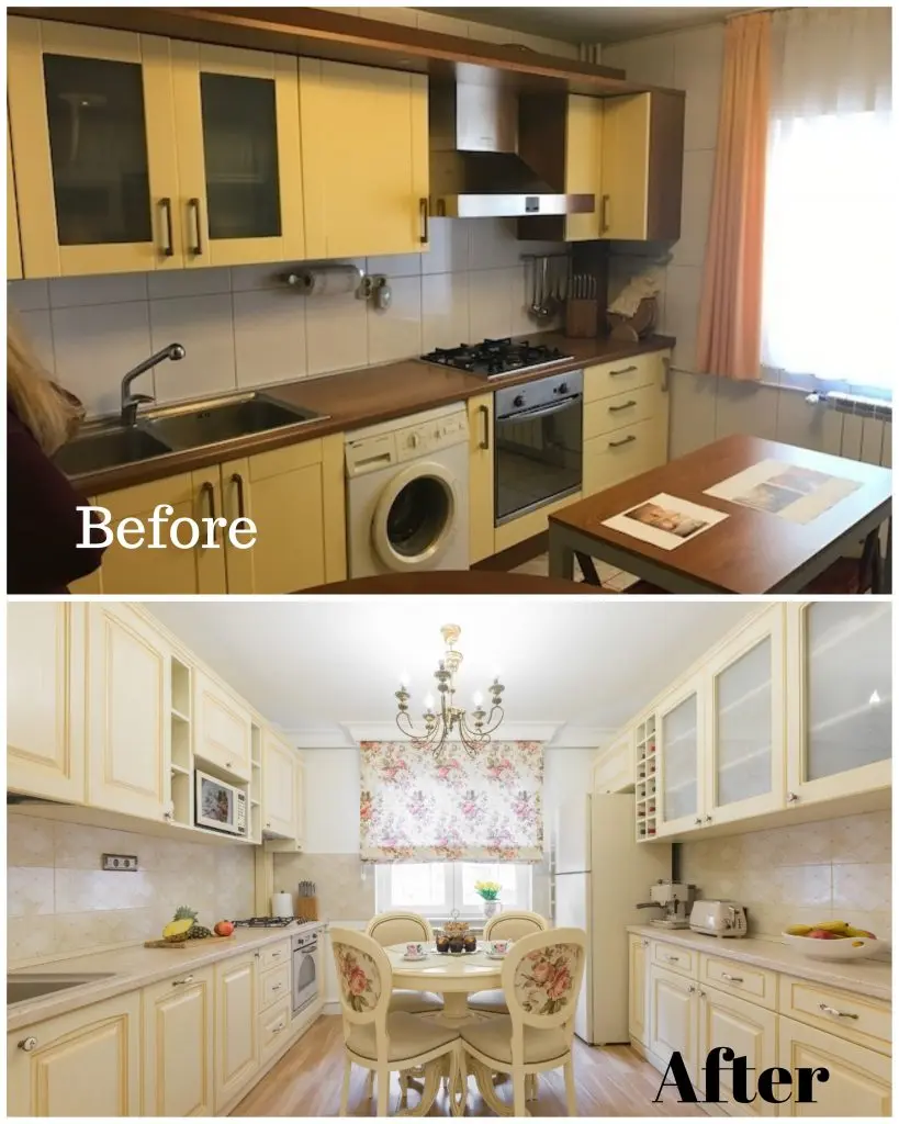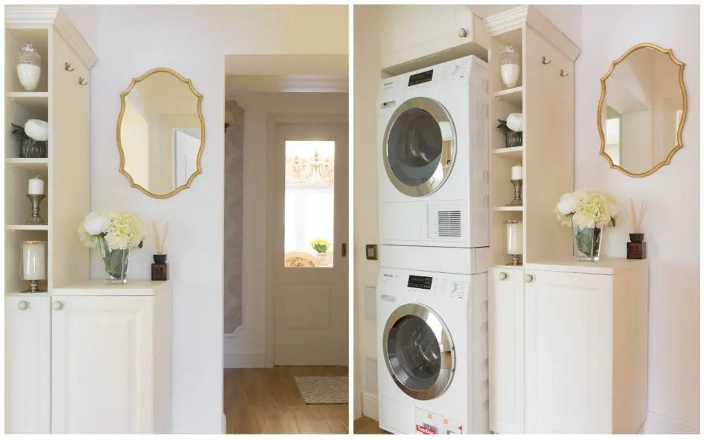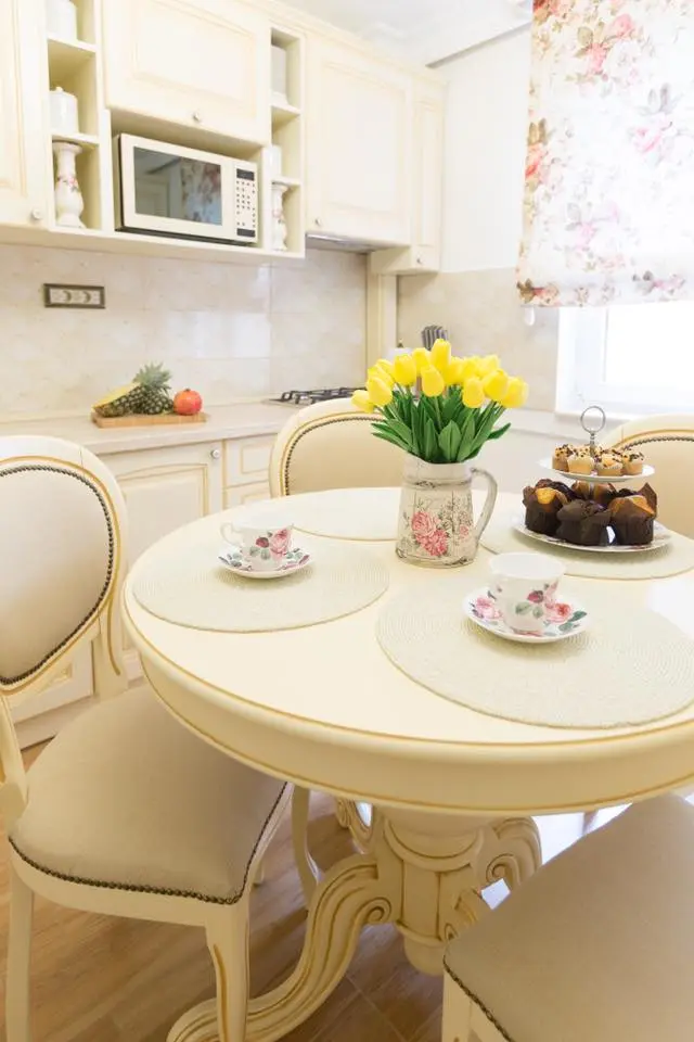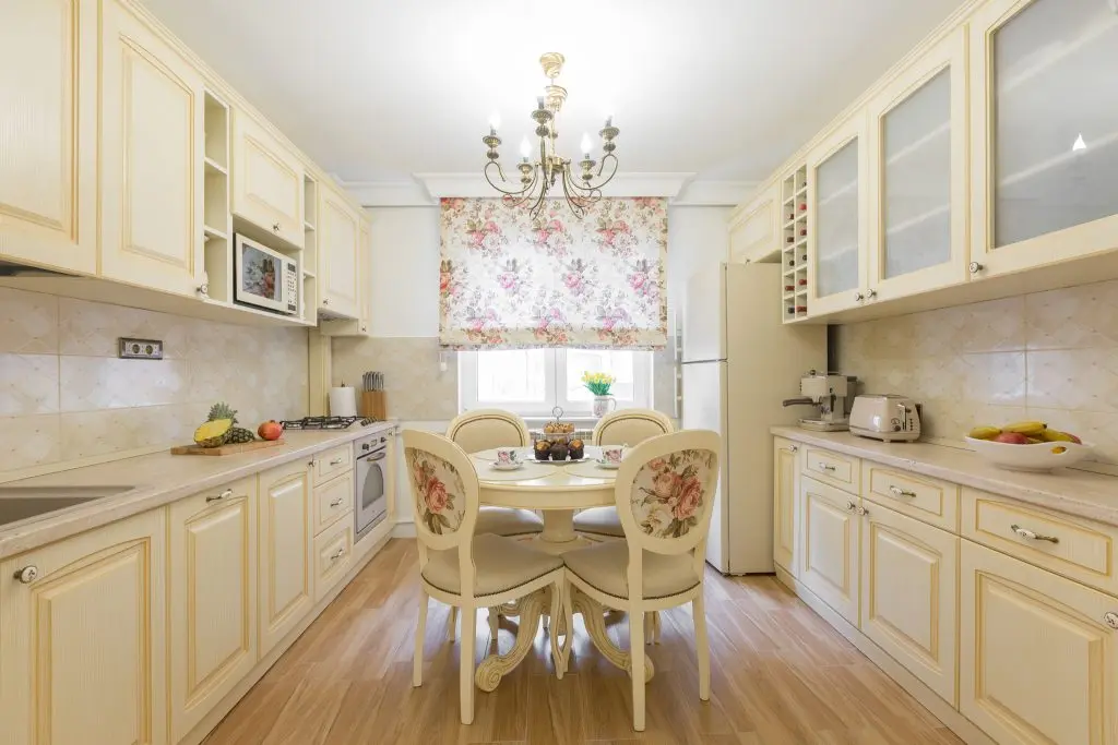 Spre deosebire de majoritatea amenajarilor cu care suntem obisnuiti, in acest caz, bucataria si livingul se separa cu ajutorul unor usi culisante. Desi finisajul mobilierului respecta aceeasi linie in cazul celor doua camere, delimitarea acestora atribuie individualitate fiecarui spatiu, lasandu-l sa isi exercite intr-o maniera fidela rolul propriu. Bucataria isi aseaza corpurile de mobilier pe ambele laturi, plasand in mijloc locul destinat servirii mesei. Eleganta acestei camere se accentueaza prin folosirea patternului inflorat in cazul jaluzelei si a tapiteriei scaunelor si alegerea electrocansicelor cu design vintage.