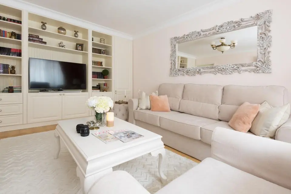 Pentru ca iluminarea naturala este deficitara din cauza pozitionarii imobilului din care face parte apartamentul, folosirea nuantelor deschise, a pastelurilor si a oglinzilor, reprezinta o solutie compensatorie. In cazul iluminatului artificial, sunt evidentiate accente pretioase si elegante, bronzul si cristalele fiind elemente de baza in componenta acestora.