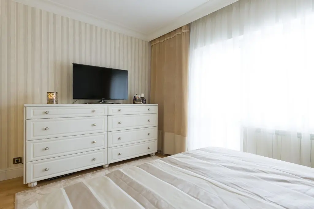 Dormitorul matrimonial scoate in evidenta un dressing ce sa intinde pe toata suprafata peretelui. Albul folosit in exces asigura luminozitatea necesara, iar texturile satinate si de catifea impreuna cu aspectul clasic al noptierelor, adauga un plus de confort incaperii.