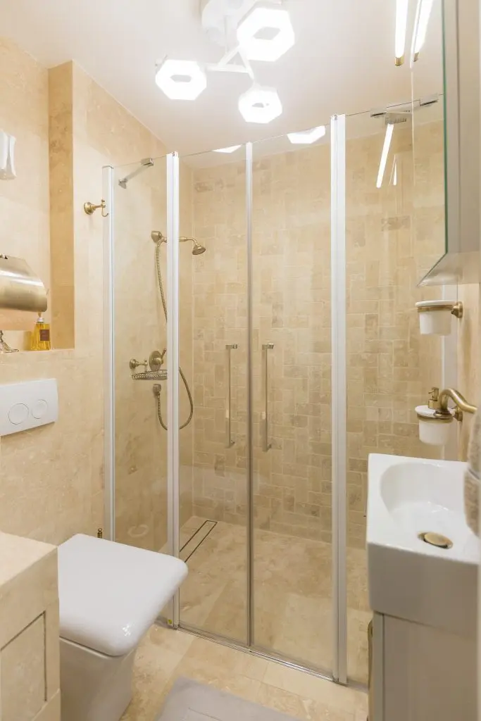 Putand fi usor comparata cu baile romane istorice, baia de serviciu este placata cu travertint mat. Zona dusului se compune din sticla pentru a oferi spatiozitate si profunzime, iar restul componentelor si accesoriilor sanitare, aduc laolalta stilul vintage si cel modern intr-o maniera omogena.Holurile capata o nota functionala, dimensiunea acestora permitand integrarea de spatii de depozitare si electrocasnice.