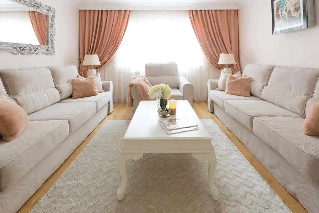 Livingul vine in continuarea bucatariei cu o simetrie aparte, pozitionand doua canapele identice in oglinda si asezand in mijlocul acestora o masa dreptunghiulara eleganta. Cele doua canapele impreuna cu fotoliul, transmit ideea de spatiu, loc de relaxare si socializare. Din punct de vedere al coloristicii, se opteaza pentru includerea accentelor de roz somon, nuanta ce asigura atribuirea unei atmosfere primavaratice si calde.