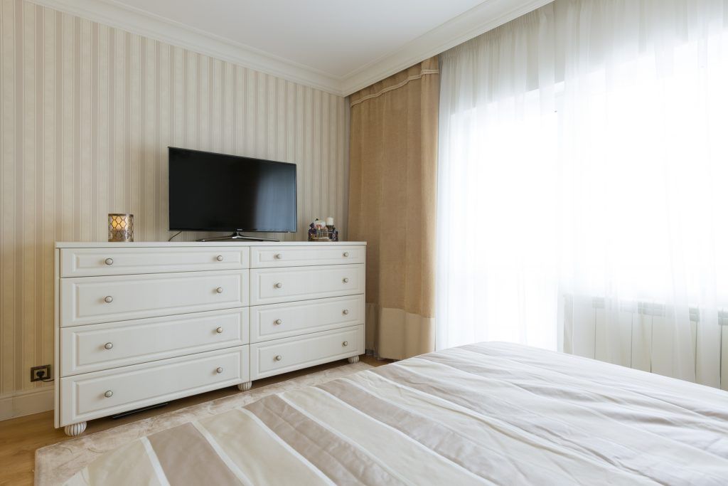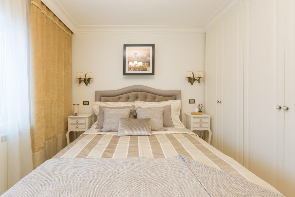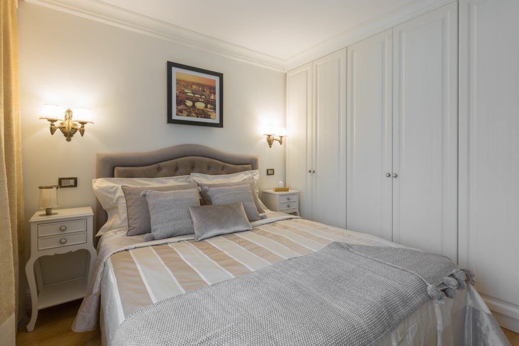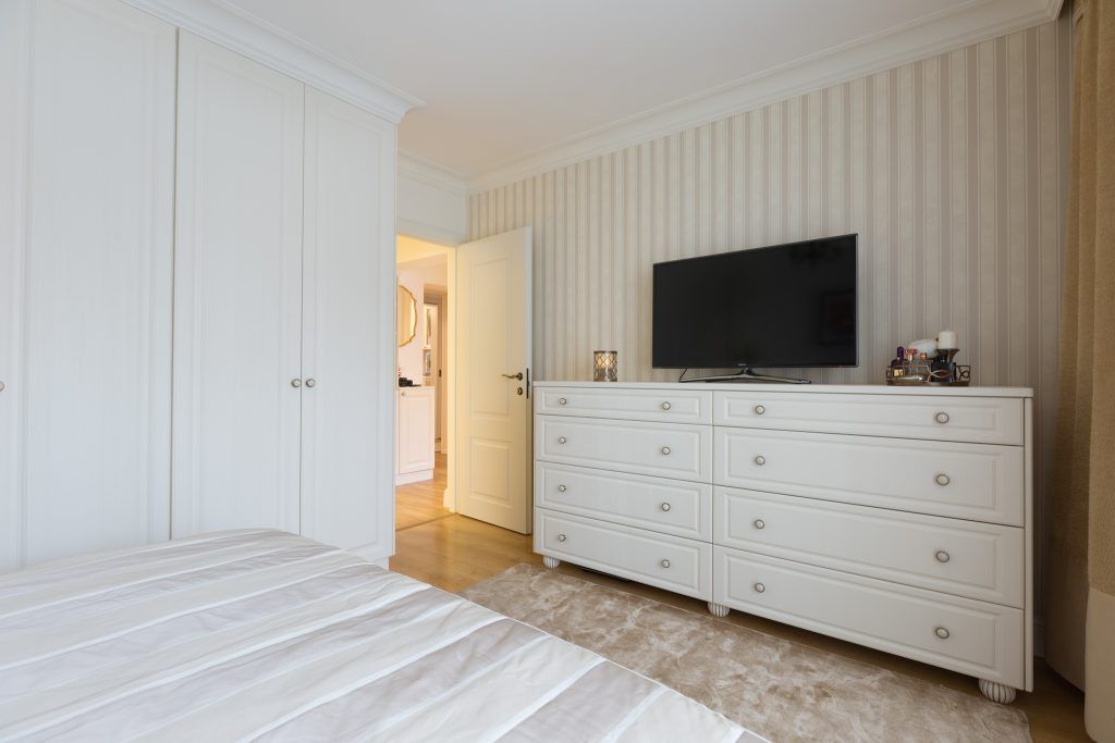 Dormitorul matrimonial scoate in evidenta un dressing ce sa intinde pe toata suprafata peretelui. Albul folosit in exces asigura luminozitatea necesara, iar texturile satinate si de catifea impreuna cu aspectul clasic al noptierelor, adauga un plus de confort incaperii.