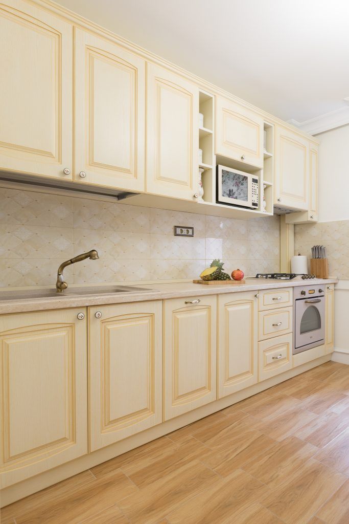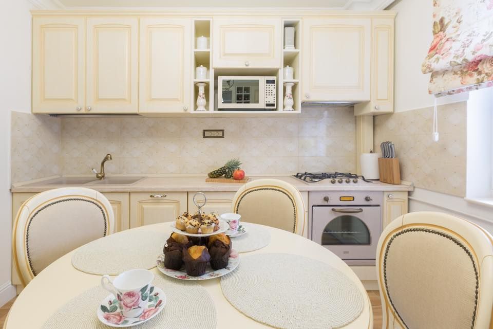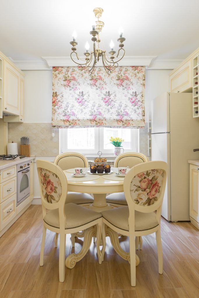Spre deosebire de majoritatea amenajarilor cu care suntem obisnuiti, in acest caz, bucataria si livingul se separa cu ajutorul unor usi culisante. Desi finisajul mobilierului respecta aceeasi linie in cazul celor doua camere, delimitarea acestora atribuie individualitate fiecarui spatiu, lasandu-l sa isi exercite intr-o maniera fidela rolul propriu. Bucataria isi aseaza corpurile de mobilier pe ambele laturi, plasand in mijloc locul destinat servirii mesei. Eleganta acestei camere se accentueaza prin folosirea patternului inflorat in cazul jaluzelei si a tapiteriei scaunelor si alegerea electrocansicelor cu design vintage.