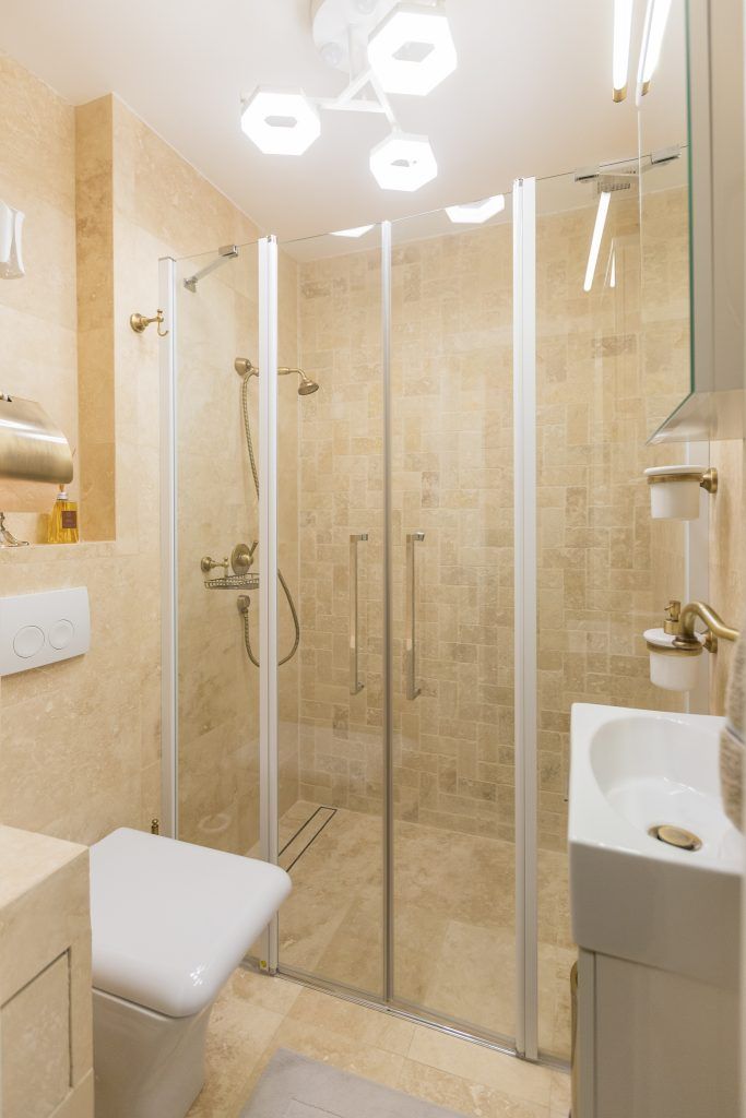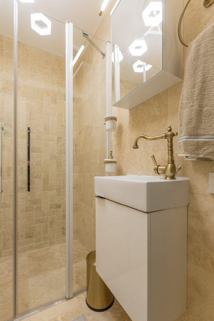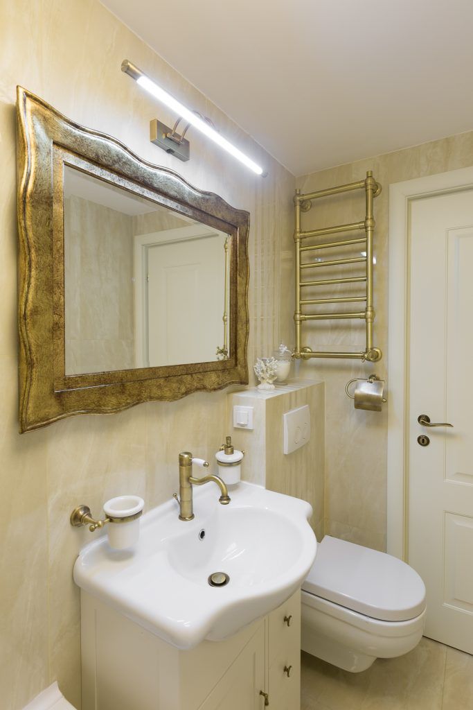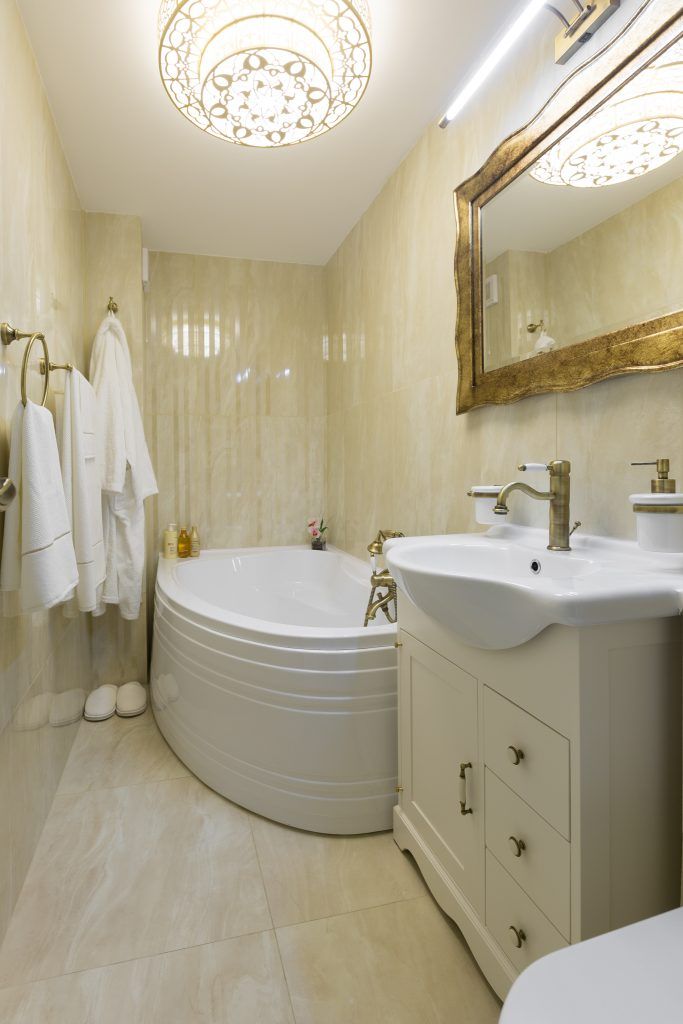 Pentru cele doua bai care intra in componenta apartamentului, se alege un stil clasic si longeviv. In cazul baii principale, se opteaza pentru o cada pe colt, un mobilier clasic si accesorii sanitare cu aspect vintage, al caror nuanta de auriu se continua in rama oglinzii de mari dimensiuni.