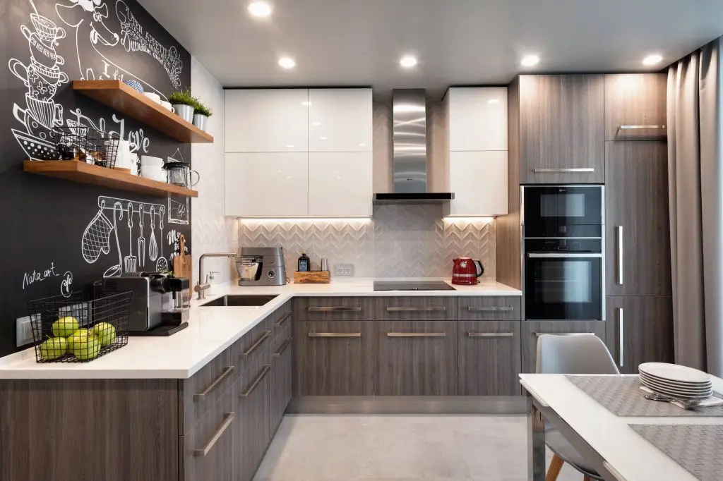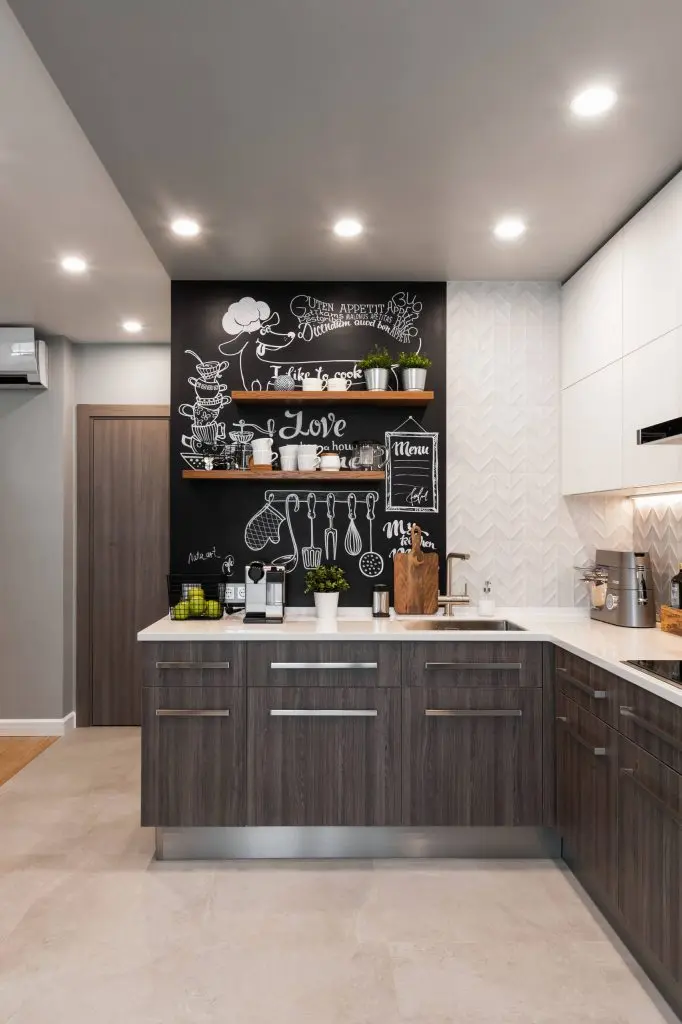 Deschide GaleriaNuantele de beige, nude, lemn natural si gri, scot in evidenta accente minimaliste si scandinave. Mobilierul bucatariei ocupa o buna suprafata a acesteia si se dovedeste a fi, pe langa modern, unul extrem de functional. Pentru o clipa ai putea spune ca te afli in incinta unui restaurant modern, si asta datorita peretelui cu suprafata inchisa si cu rol de tabla de scris, unde se regasesc pictate desene tematice. Corpurile superioare ale mobilierului sunt separate de catre blat print-o banda de led-uri iar peretele despartitor este reliefat cu modele abstracte.