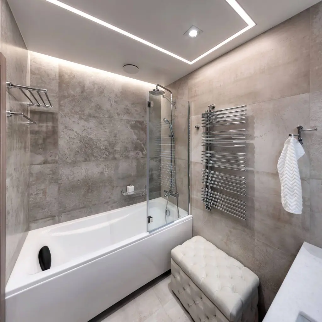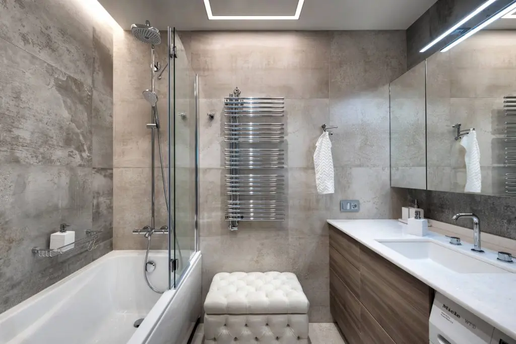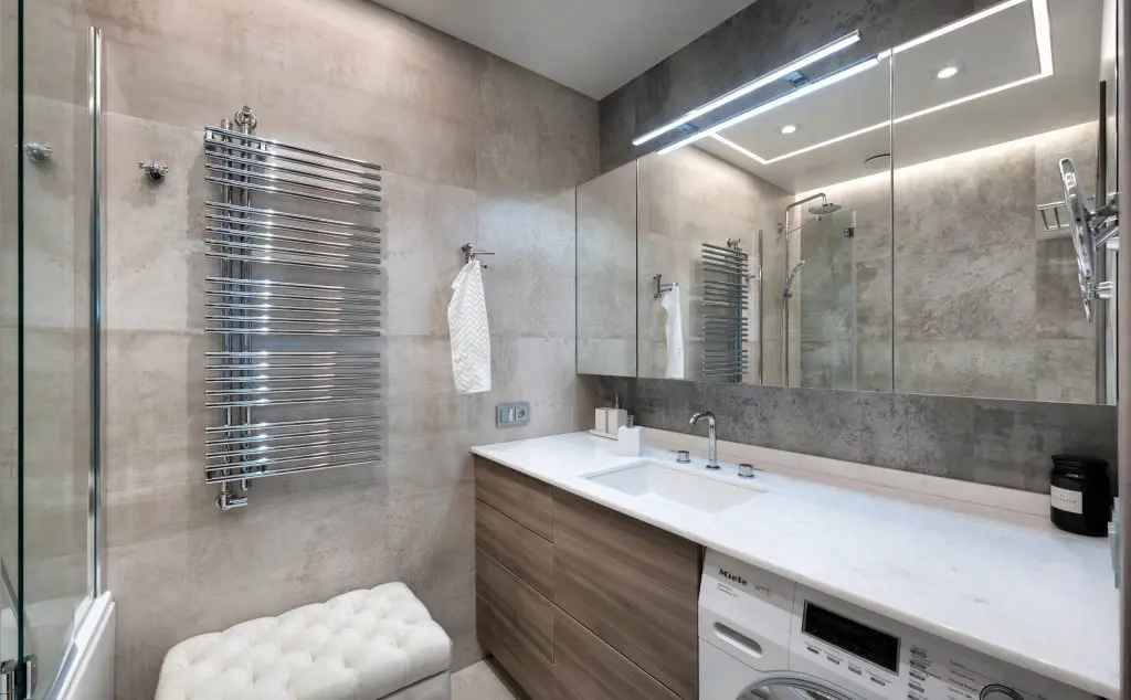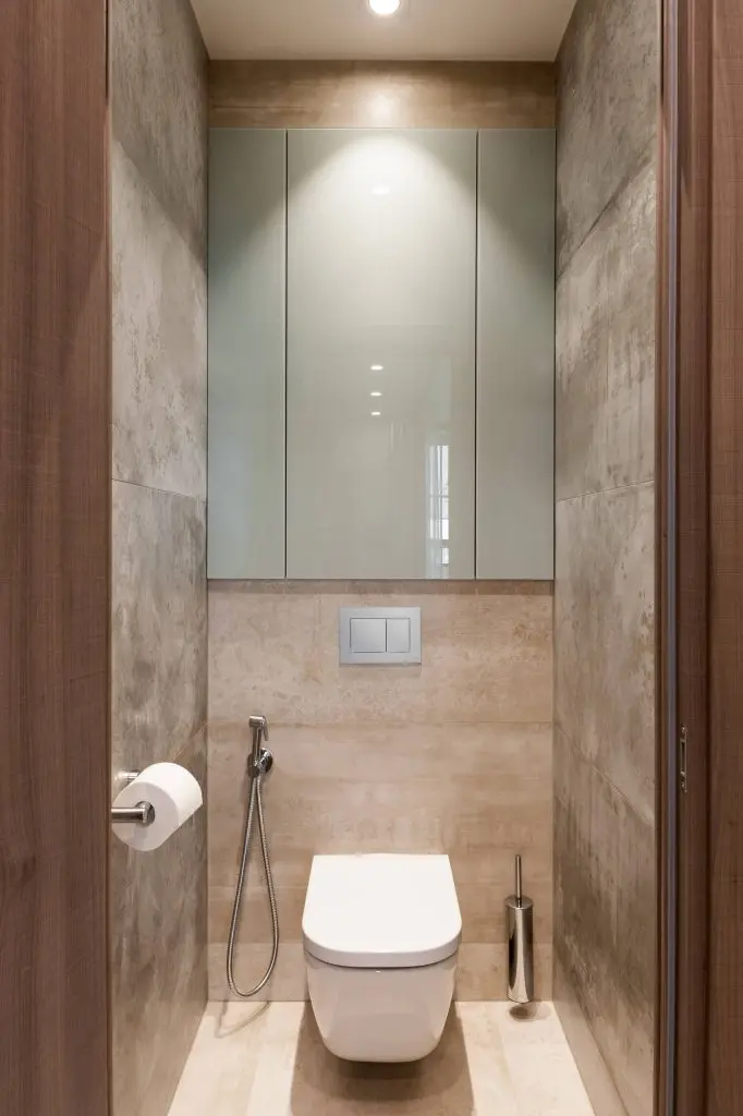 Baia are la baza nuantele de beige si lemn natural. Structura moderna a acesteia transforma dulapurile suprapuse intr-o oglina de mari dimensiuni sub care regasim un blat care, prin intermediul lungimii sale, ofera functionalitate intregii incaperi. Spre deosebire de alte bai, aici ne este atrasa atentia de un taburete al carui rol este practic si totodata estetic.