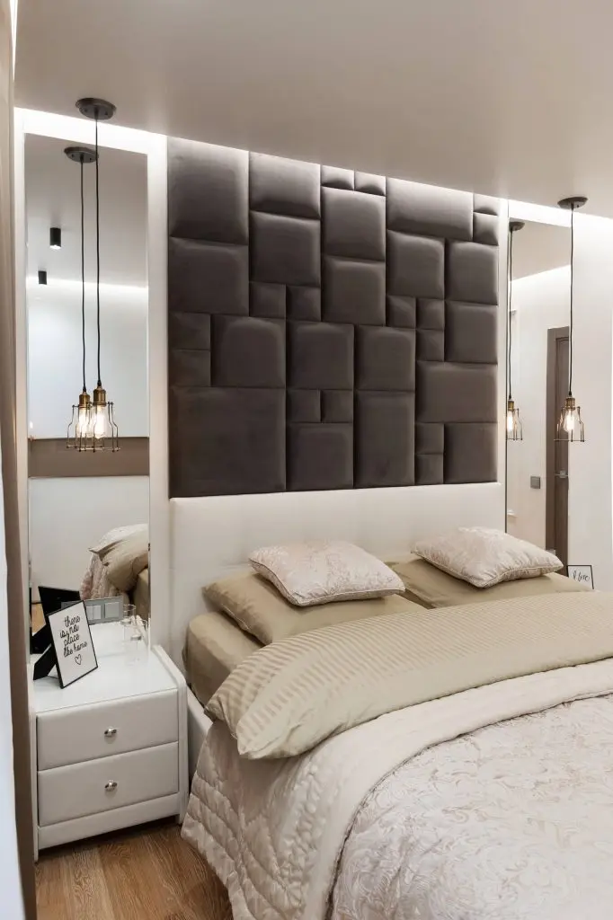 Dormitorul pastreaza cromatica open space-ului si pozitioneaza central un pat dublu supradimensionat al carei tablii moderne se continua pe toata inaltimea peretelui pe care aceasta este asezata. Oglinzile regasite in lateralele patului contureaza impreuna cu obiectele de iluminat, iluzia maririi spatiului, iluzie la care se adauga si dressing-ul si mobilierul, ascunse mural.