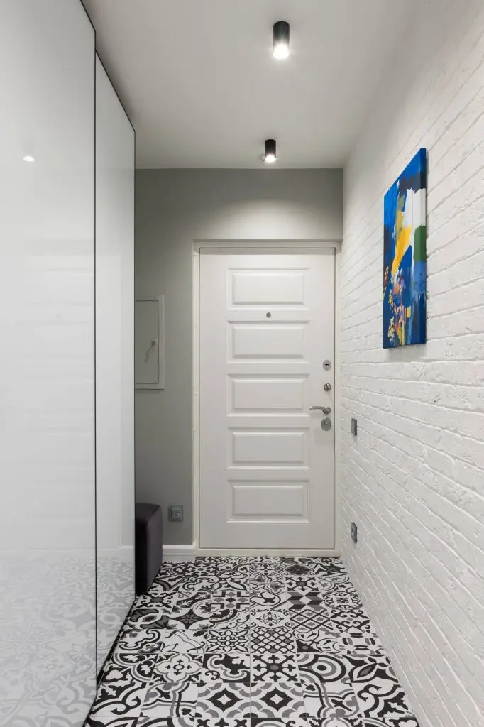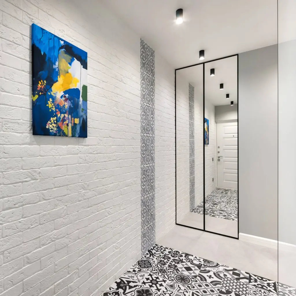 Design-ul holului contureaza o cu totul alta poveste care se continua si in spatiul balconului. Se pot observa folosirea din abundenta a non culorilor si a pattern-urilor incarcate regasite in placile de faianta si gresie. Vorbim de un dressing generos si reliefare murala cu aspect de caramida, iar planul foarte putin colorat va fi scos in evidenta de o pictura multicolora abstracta, in cazul holului, si de plantele de apartament in verde natural, in cazul balconului.