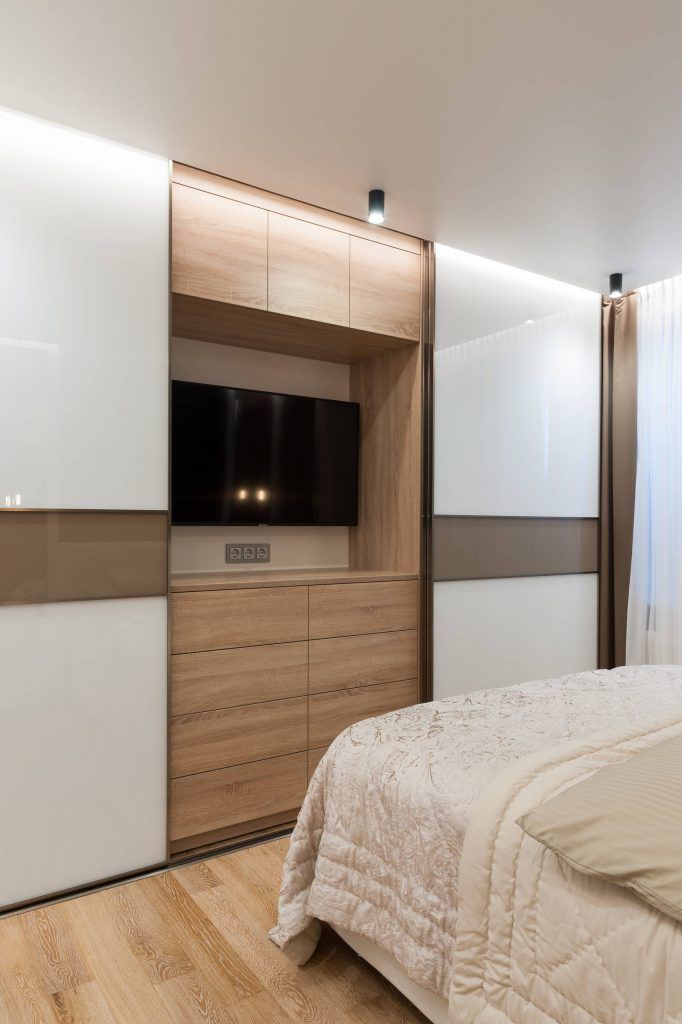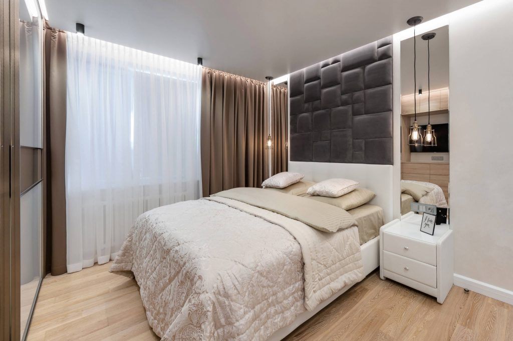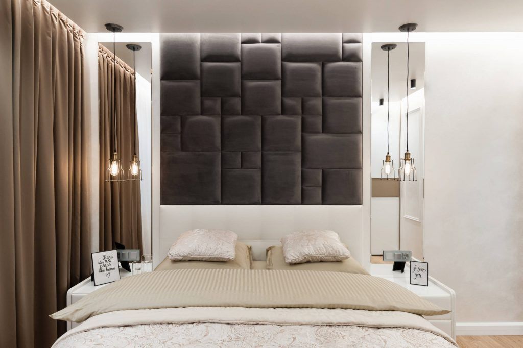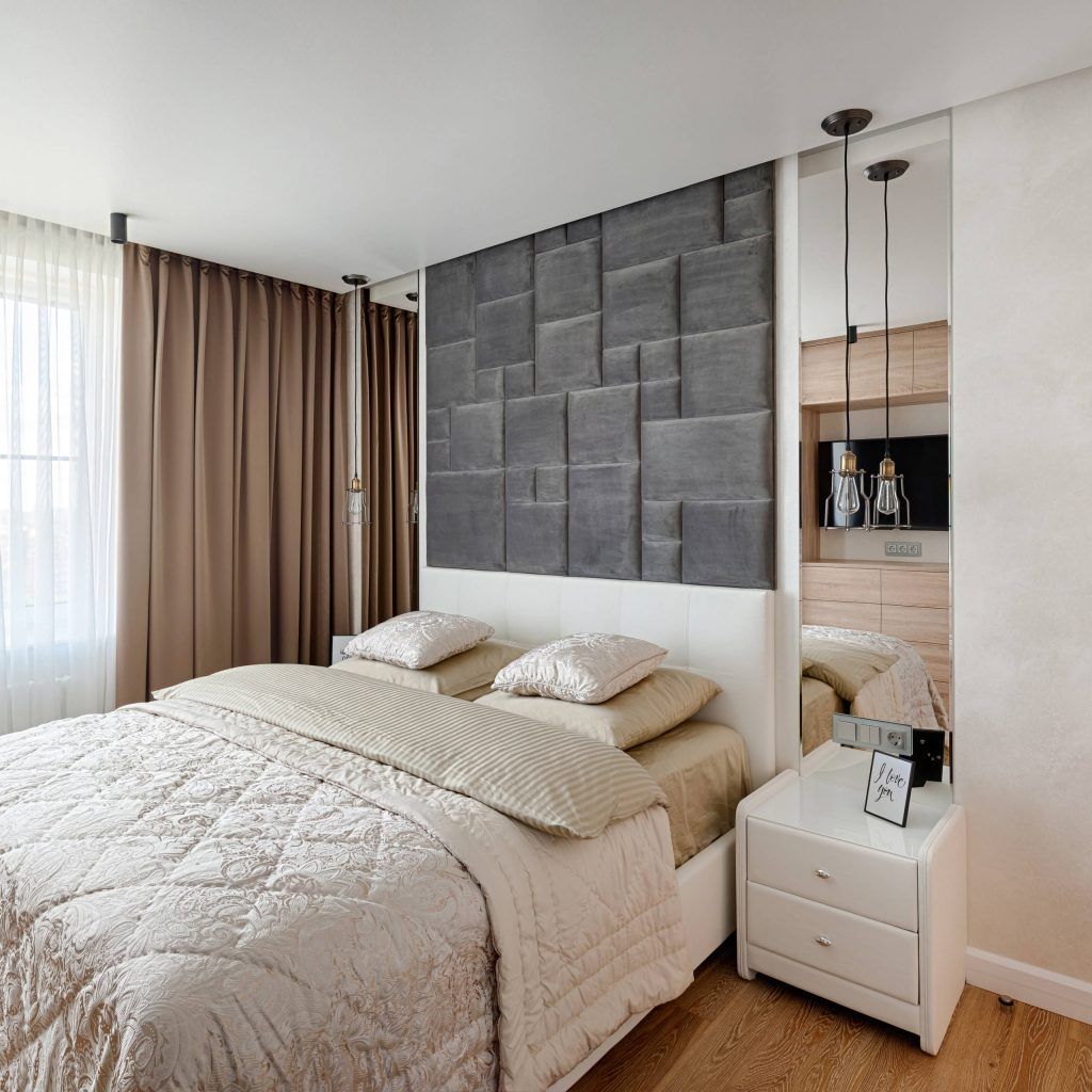 Dormitorul pastreaza cromatica open space-ului si pozitioneaza central un pat dublu supradimensionat al carei tablii moderne se continua pe toata inaltimea peretelui pe care aceasta este asezata. Oglinzile regasite in lateralele patului contureaza impreuna cu obiectele de iluminat, iluzia maririi spatiului, iluzie la care se adauga si dressing-ul si mobilierul, ascunse mural.