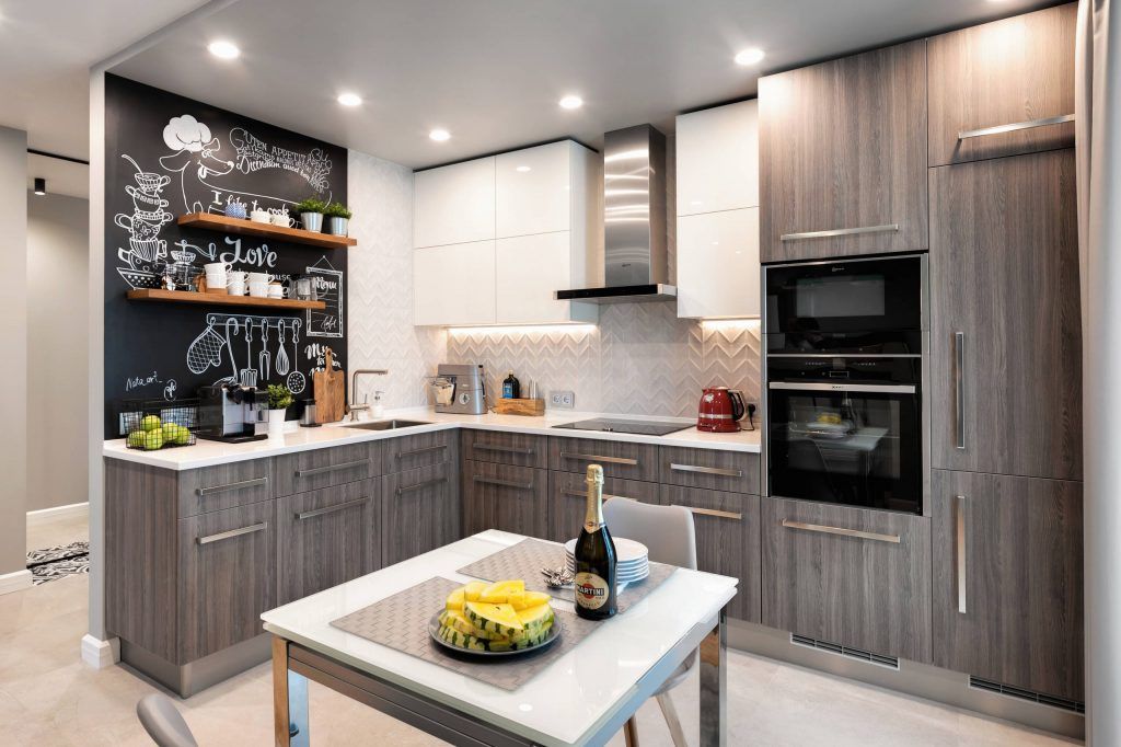 Deschide GaleriaNuantele de beige, nude, lemn natural si gri, scot in evidenta accente minimaliste si scandinave. Mobilierul bucatariei ocupa o buna suprafata a acesteia si se dovedeste a fi, pe langa modern, unul extrem de functional. Pentru o clipa ai putea spune ca te afli in incinta unui restaurant modern, si asta datorita peretelui cu suprafata inchisa si cu rol de tabla de scris, unde se regasesc pictate desene tematice. Corpurile superioare ale mobilierului sunt separate de catre blat print-o banda de led-uri iar peretele despartitor este reliefat cu modele abstracte.