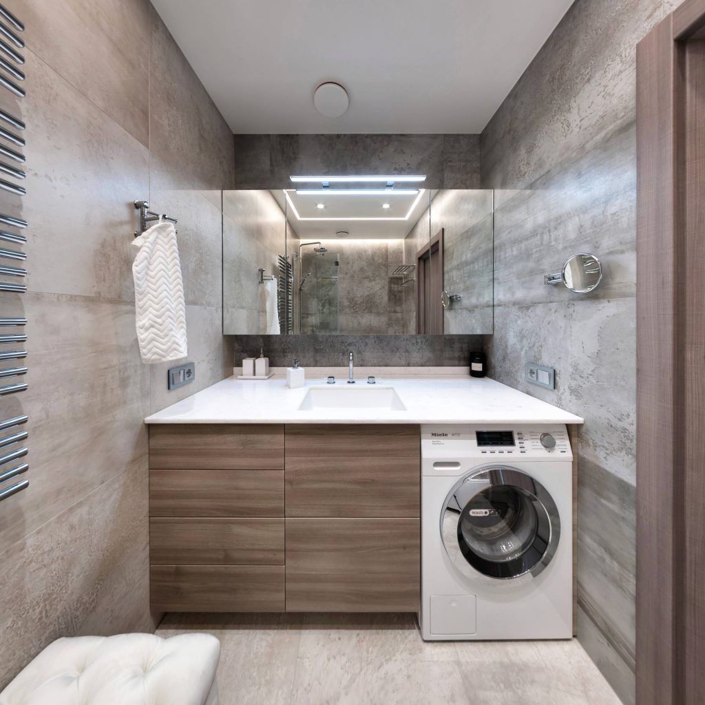 Baia are la baza nuantele de beige si lemn natural. Structura moderna a acesteia transforma dulapurile suprapuse intr-o oglina de mari dimensiuni sub care regasim un blat care, prin intermediul lungimii sale, ofera functionalitate intregii incaperi. Spre deosebire de alte bai, aici ne este atrasa atentia de un taburete al carui rol este practic si totodata estetic.