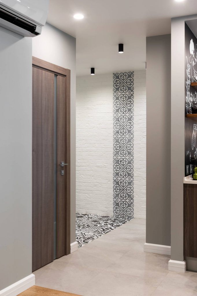 Design-ul holului contureaza o cu totul alta poveste care se continua si in spatiul balconului. Se pot observa folosirea din abundenta a non culorilor si a pattern-urilor incarcate regasite in placile de faianta si gresie. Vorbim de un dressing generos si reliefare murala cu aspect de caramida, iar planul foarte putin colorat va fi scos in evidenta de o pictura multicolora abstracta, in cazul holului, si de plantele de apartament in verde natural, in cazul balconului.