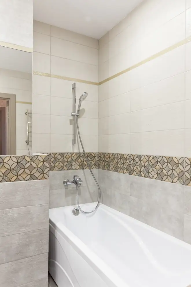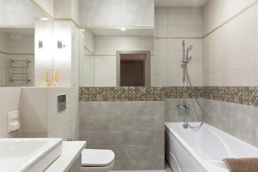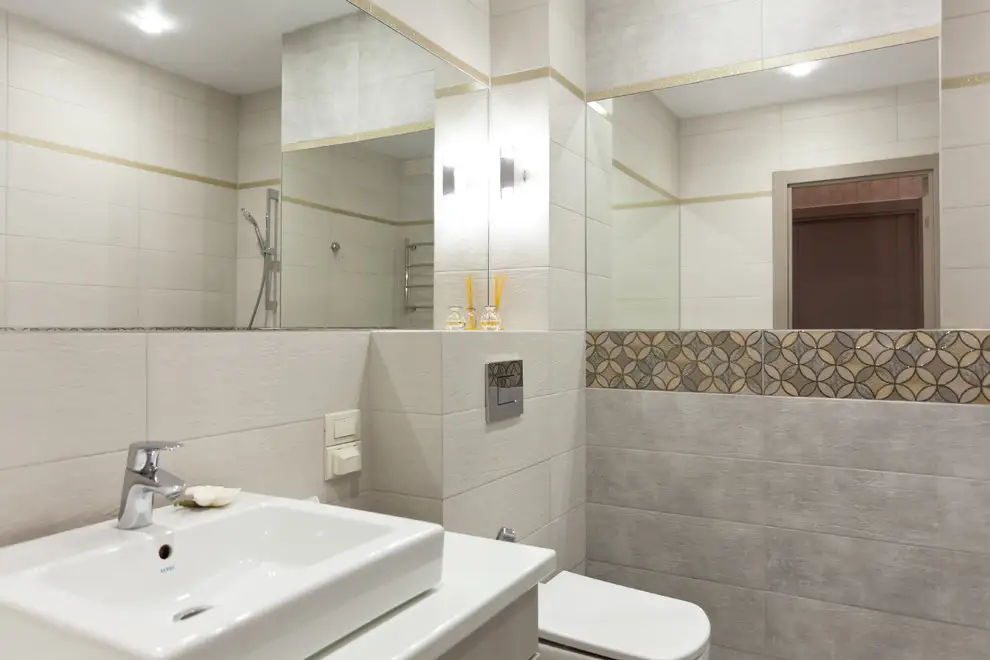 Evidentierea acestuia ca punct de interes se face cu ajutorul unor candelabre mici si de efect. Placile de faianta care separa blatul de corpurile superioare ale mobilei respecta pattern-ul geometric al tapetului folosit in dormitor si spatiul holului.
