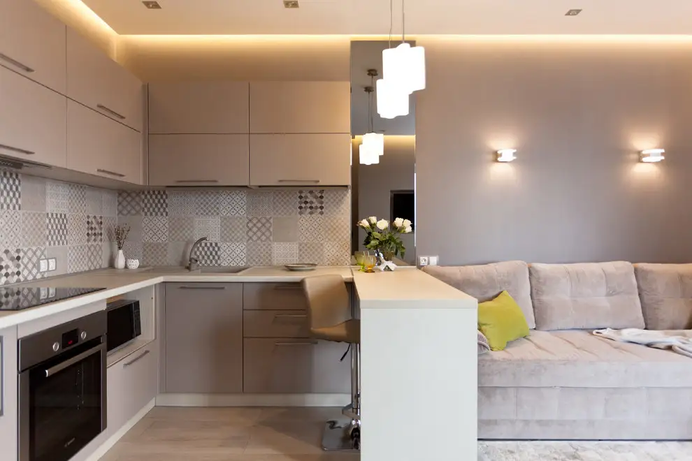 Open space-ul format din bucatarie si living pastreaza cromatica intregului spatiu, atat mural cat si in mobilier si accesorii. Mobilierul bucatariei este compact si minimalist, pozitionat functional pentru a permite largirea vizuala. Separarea zonei de pregatire a mesei se face printr-un bar cu rol de servire a acesteia, care se continua mural cu o oglinda.