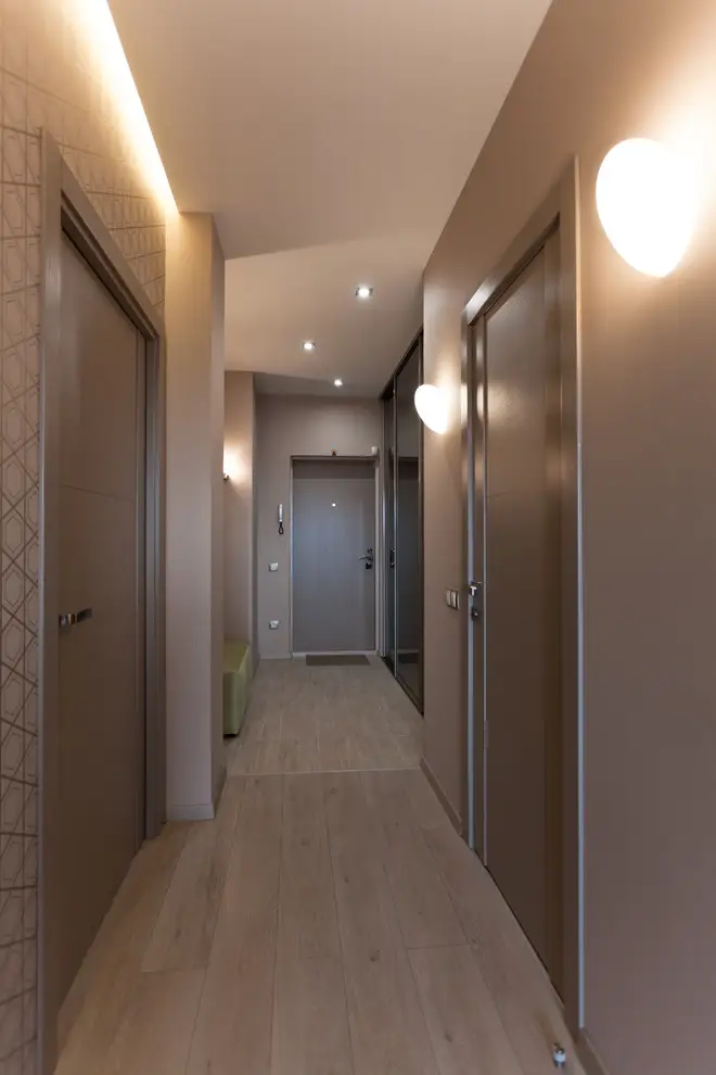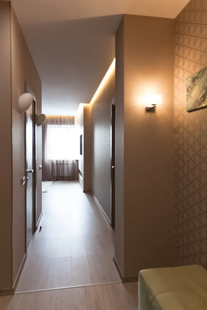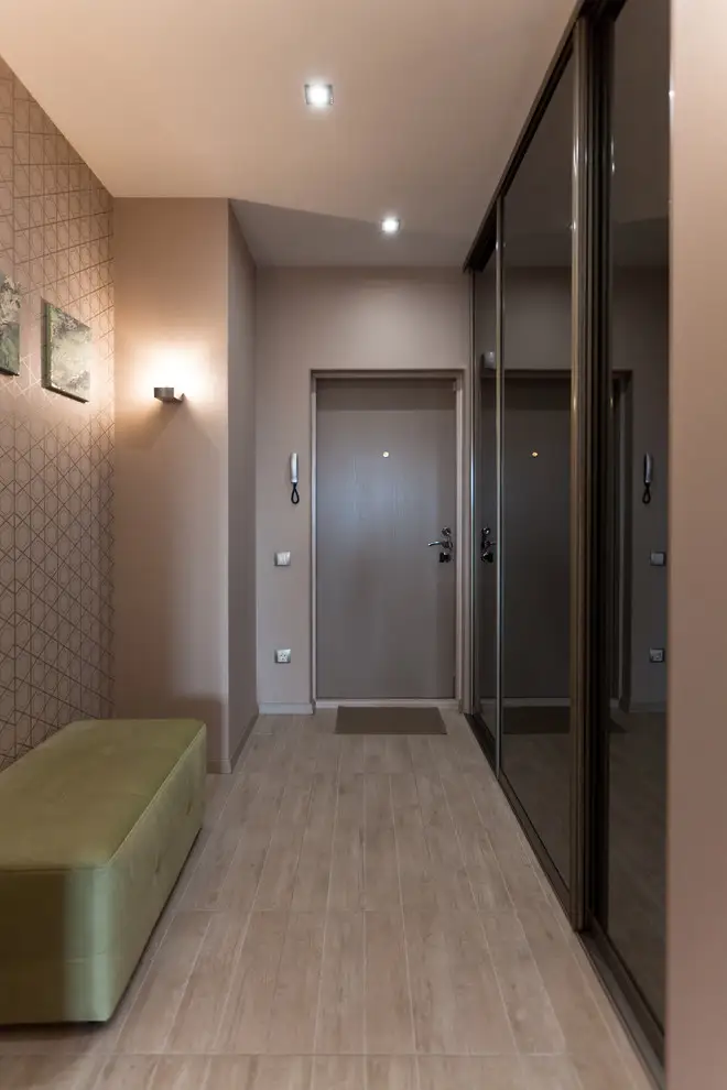 Holul pune fata in fata o canapea si un dressing de mari dimensiuni si urmeaza paleta de culori pastelate si naturale, devenind astfel punctul de introducere in amenajarea romantica propriu-zisa.