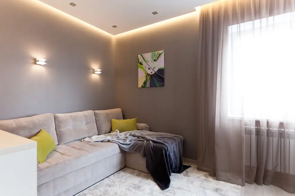 Zona living-ului aduce in prim plan un coltar din catifea accesorizat cu nuante de galben pal asortate perfect cu tabloul pozitionat in lateral. Atmosfera romantica nu se pierde nici aici, ea iesind la suprafata tot prin iluminarea discreta pusa la dispozitie de benzile de led si lampile incastrate aflate in spatele canapelei.
