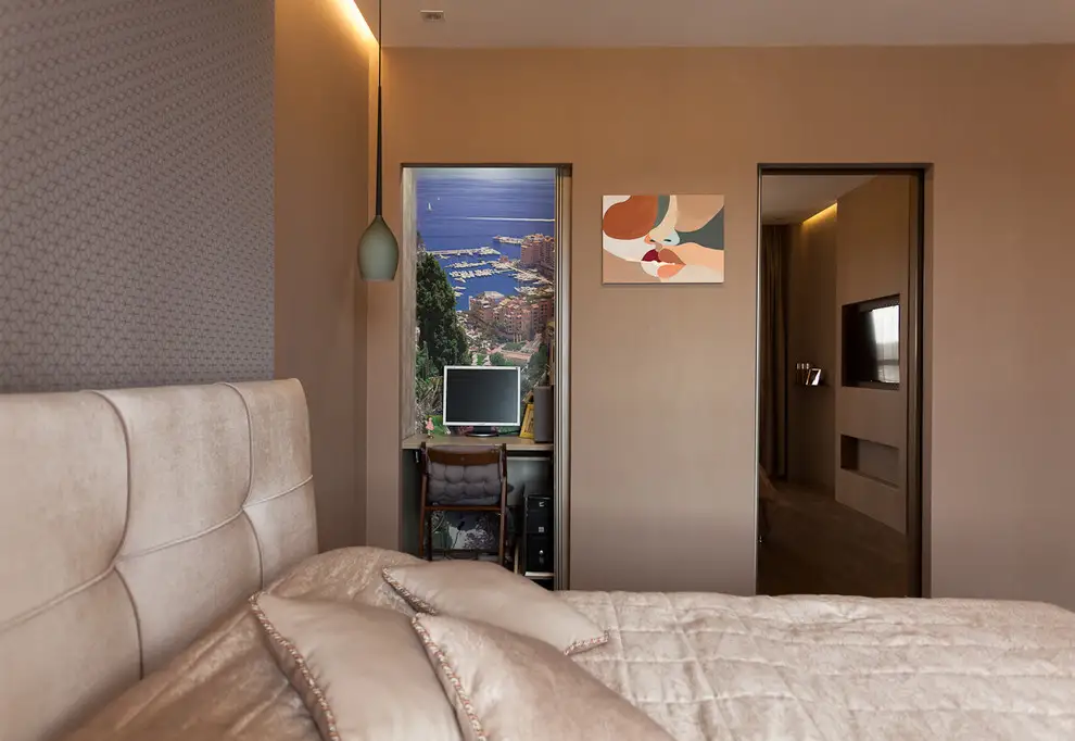 Cum modernul nu se lasa mai prejos, o buna parte din peretele despartitor incastreaza in spatele unei usi glisante un birou si un scaun de mici dimensiuni. Tot din familia accesoriilor moderne putem enumera electrocasnicele, noptierele, usile si tabloul abstract.