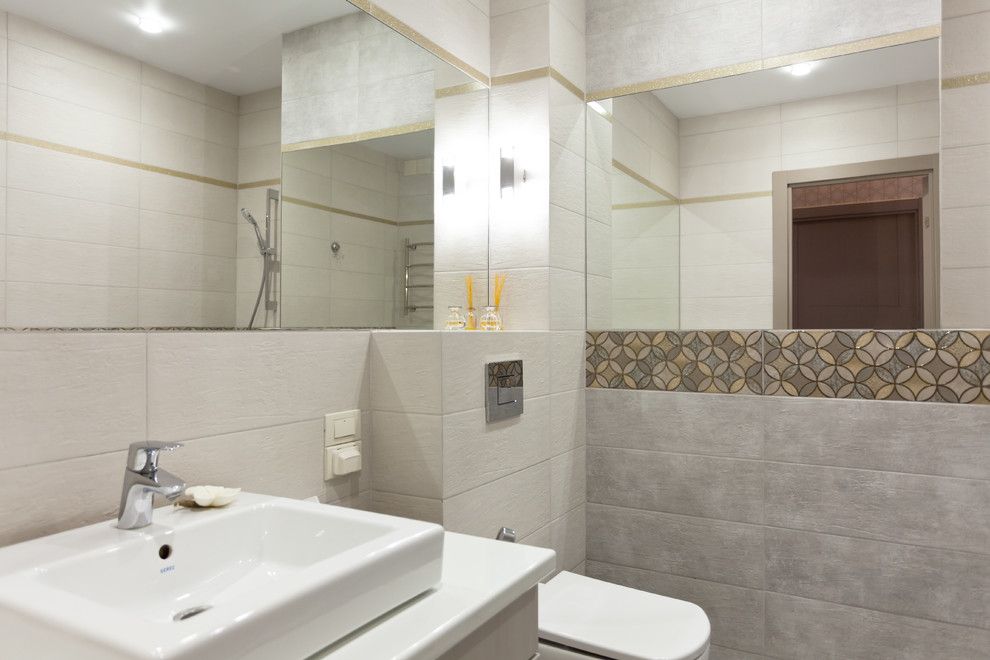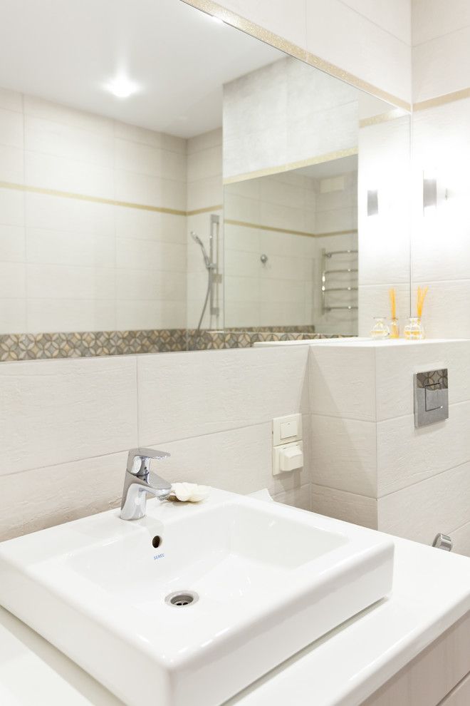 Baia se separa de celelalte incaperi, atat prin folosirea non-culorilor, cat si prin alegerea unor pattern-uri complet diferite. Oglinda extinsa permite largirea vizuala a intregului spatiu si, impreuna cu alb-ul folosit in exces, dau senzatia de curat si proaspat. Lumina in acest caz este una generoasa, fara a se mai apela la nuante care duc in planul romantic.