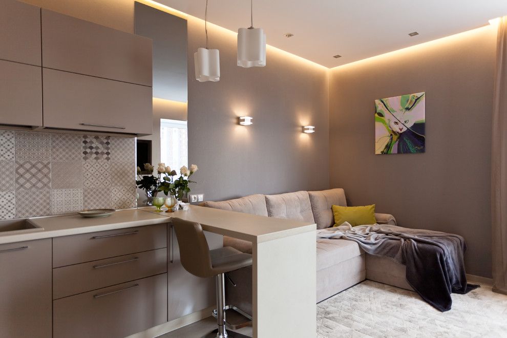 Open space-ul format din bucatarie si living pastreaza cromatica intregului spatiu, atat mural cat si in mobilier si accesorii. Mobilierul bucatariei este compact si minimalist, pozitionat functional pentru a permite largirea vizuala. Separarea zonei de pregatire a mesei se face printr-un bar cu rol de servire a acesteia, care se continua mural cu o oglinda.