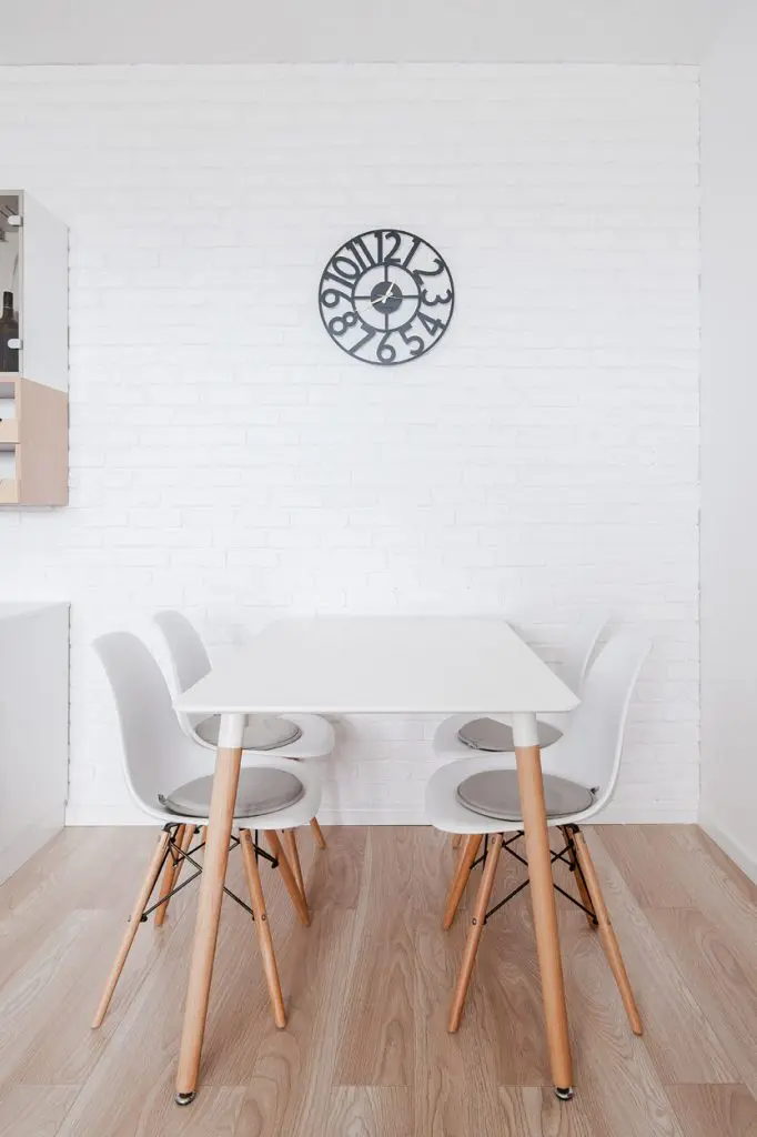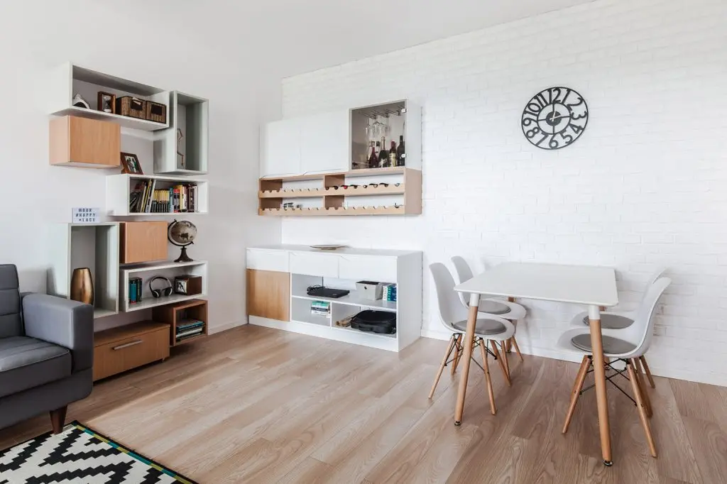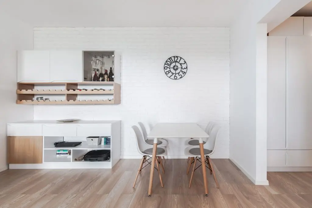 Textura de caramida alba de pe peretele cu masa din living accentueaza atmosfera calda si luminoasa a locuintei si in acelasi timp creeaza un fundal placut pentru piesele de decor si mobilierul din lemn. Pe peretele adiacent, compozitia de corpuri de mobilier suspendate confera dinamism spatiului.