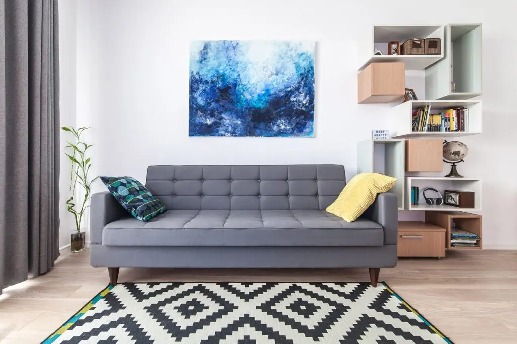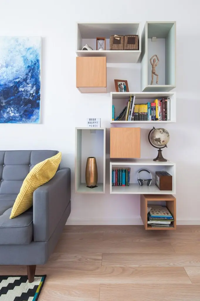 Alternanta finisajelor acestei biblioteci modulare (mdf vopsit alb si mdf furniruit) asigura o continuitate a limbajului vizual in intreaga amenjare. Tonurile puternice de albastru ale tabloului de deasupra canapelei si modelul geometric al covorului completeaza armonios decorul din living.