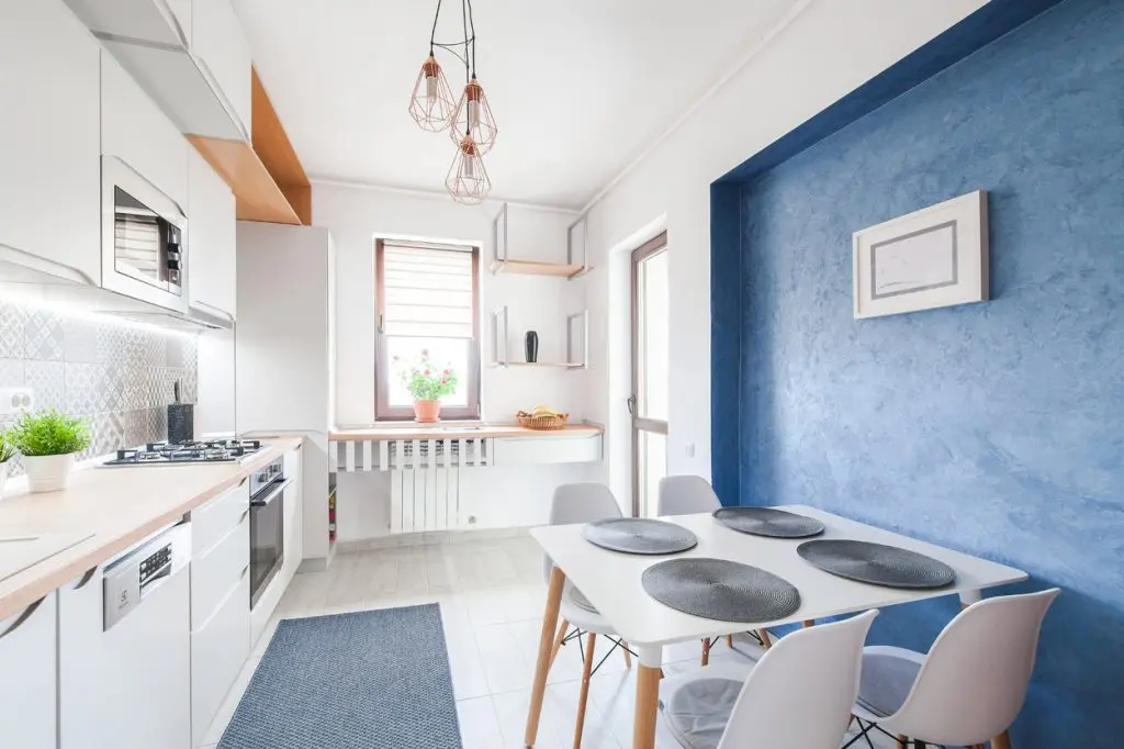 Paleta cromatica este in concordanta cu stilul ales; luminozitatea generala a locuintei si atmosfera minimalista sunt asigurate de utilizarea albului pentru finisajele peretilor. Unul dintre accentele de culoare il regasim in bucatarie, in nisa dedicata locului de luat masa, unde a fost aplicata o vopsea decorativa intr-o nuanta de albastru intens. Schimbarea culorii si a texturii marcheaza elegant zonificarea spatiilor.