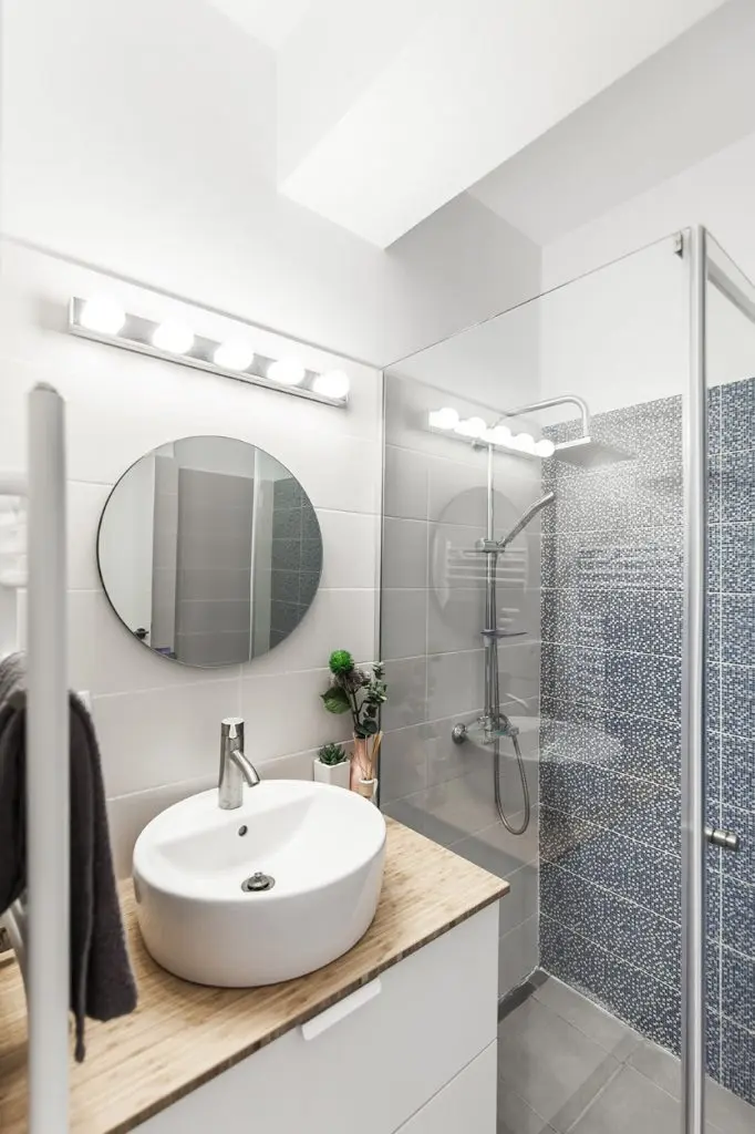 Baia din hol a fost amenajata simplu si modern fara excese de piese de decor. Dusul generos , de tip walk-in, este marcat prin peretele longitudinal finisat cu mozaic in nuante de albastru.
