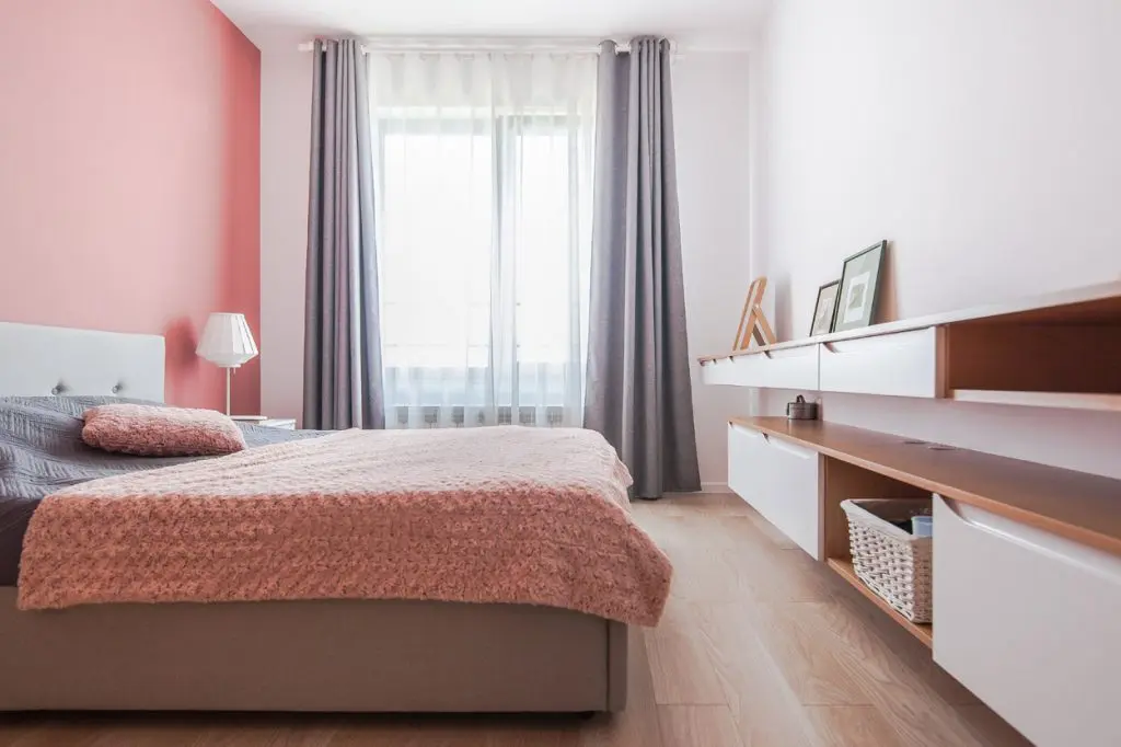 Peretele din dormitorul matrimonial pe care este amplasata tablia din textil gri a patului a fost accentuat printr-o nuanta curajoasa de rosu -Bordeaux. Decorul din dormitor este pus in valoare prin jocul de lumini si umbre creat de corpul de iluminat suspendat.
