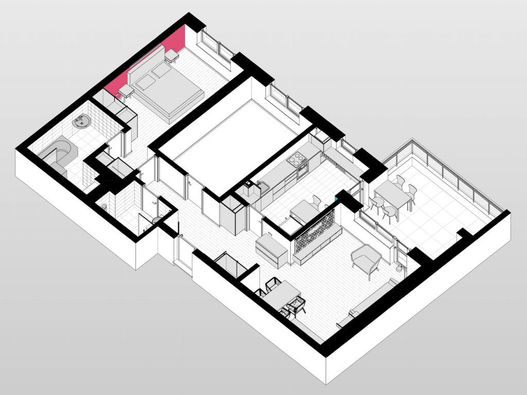 O mare parte a mobilierului a fost realizata la comanda pentru o utilizare cat mai eficienta a spatiului disponibil. Nuantele de alb si gri deschis impreuna cu accentele de lemn ale mobilierului redau atmosfera dorita de catre beneficiari.