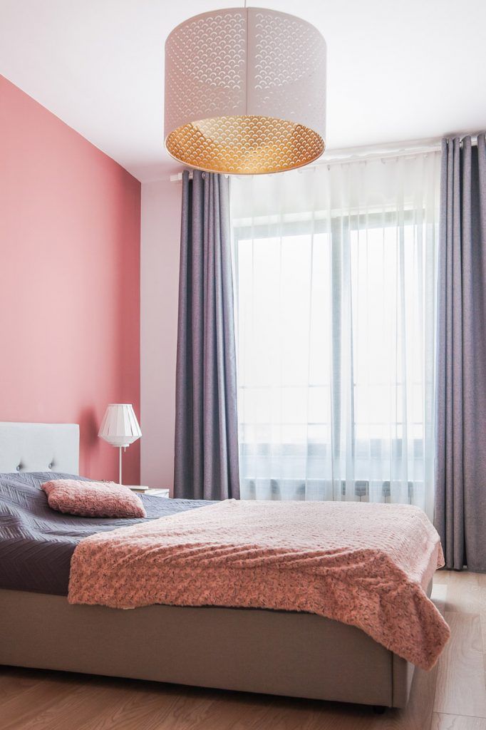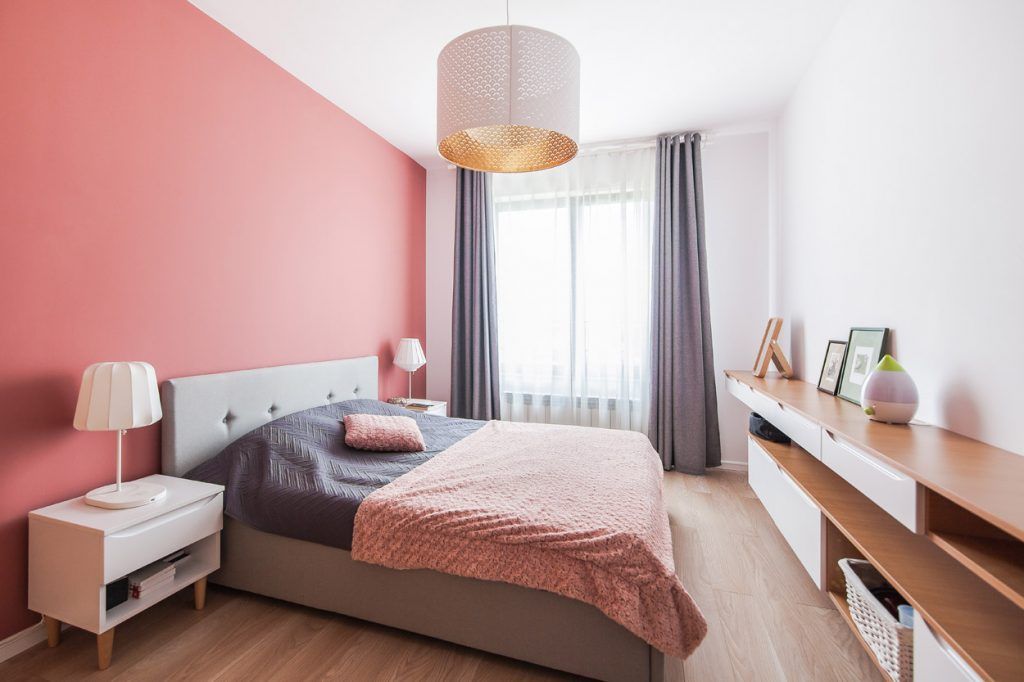Peretele din dormitorul matrimonial pe care este amplasata tablia din textil gri a patului a fost accentuat printr-o nuanta curajoasa de rosu -Bordeaux. Decorul din dormitor este pus in valoare prin jocul de lumini si umbre creat de corpul de iluminat suspendat.
