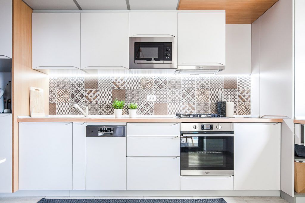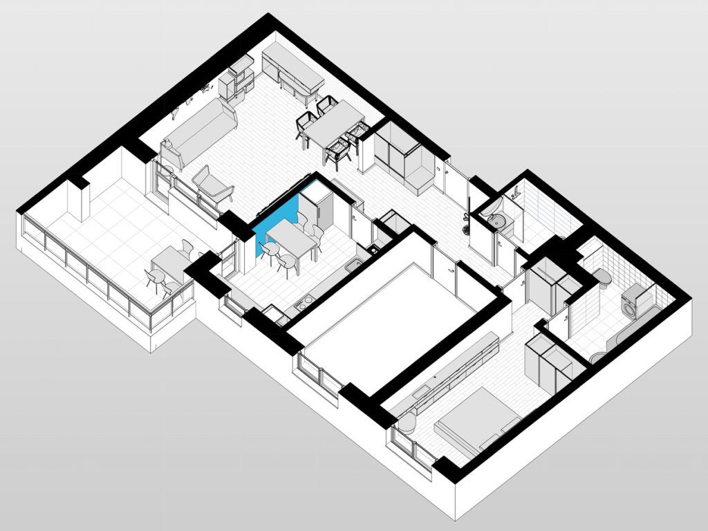 Paleta cromatica este in concordanta cu stilul ales; luminozitatea generala a locuintei si atmosfera minimalista sunt asigurate de utilizarea albului pentru finisajele peretilor. Unul dintre accentele de culoare il regasim in bucatarie, in nisa dedicata locului de luat masa, unde a fost aplicata o vopsea decorativa intr-o nuanta de albastru intens. Schimbarea culorii si a texturii marcheaza elegant zonificarea spatiilor.