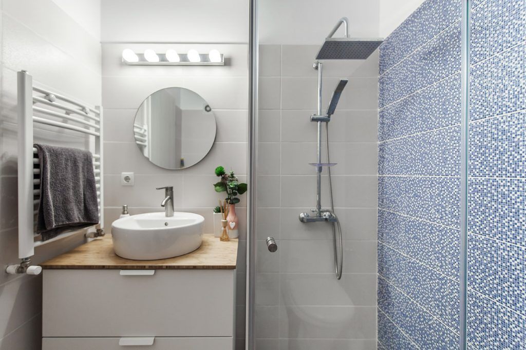 Baia din hol a fost amenajata simplu si modern fara excese de piese de decor. Dusul generos , de tip walk-in, este marcat prin peretele longitudinal finisat cu mozaic in nuante de albastru.
