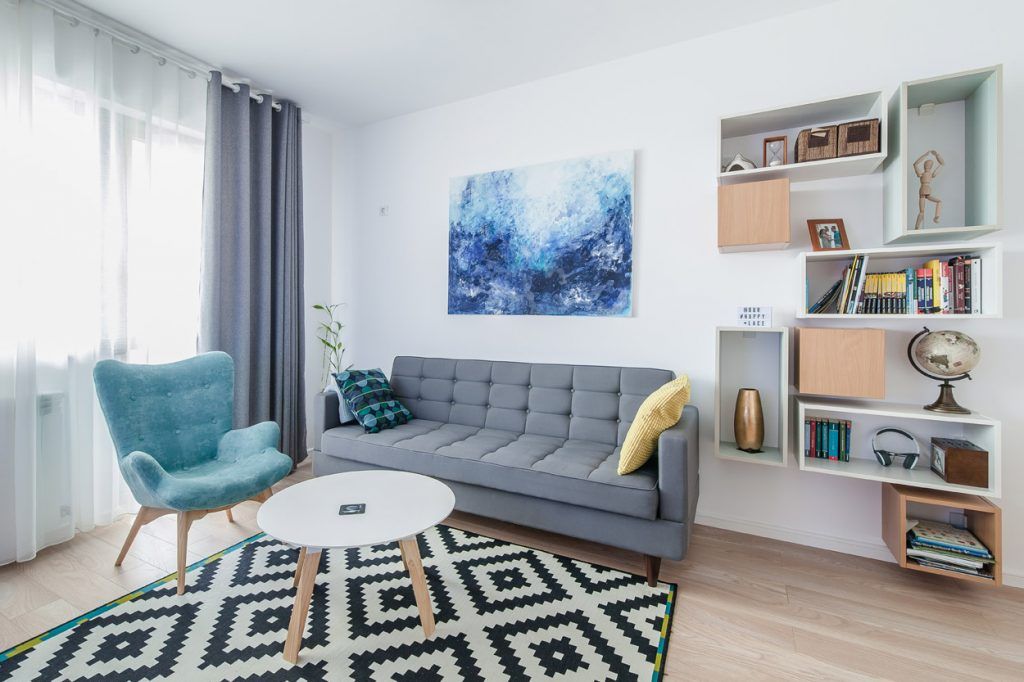 Alternanta finisajelor acestei biblioteci modulare (mdf vopsit alb si mdf furniruit) asigura o continuitate a limbajului vizual in intreaga amenjare. Tonurile puternice de albastru ale tabloului de deasupra canapelei si modelul geometric al covorului completeaza armonios decorul din living.