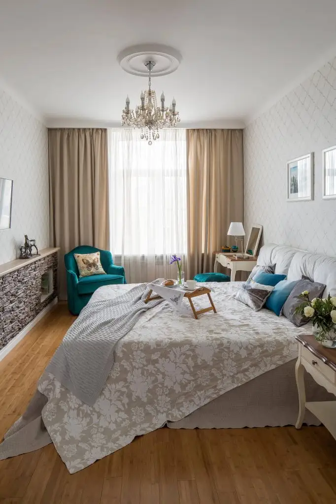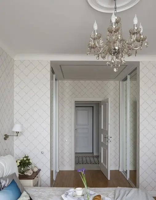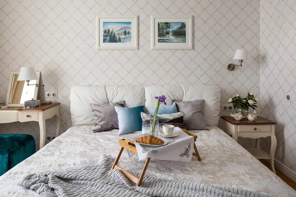 Designul mobilierului si decoratiunile ne inspira un aer romantic, nostalgic, iar modelul discret al tapetului armonizeaza elementele ce compun aceasta amenajare a dormitorului.