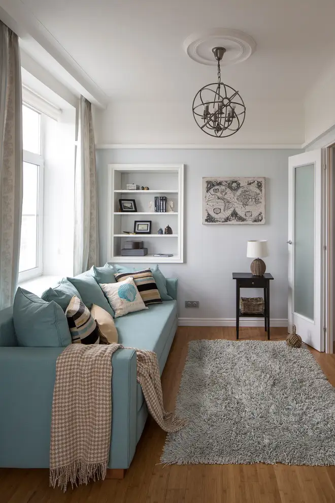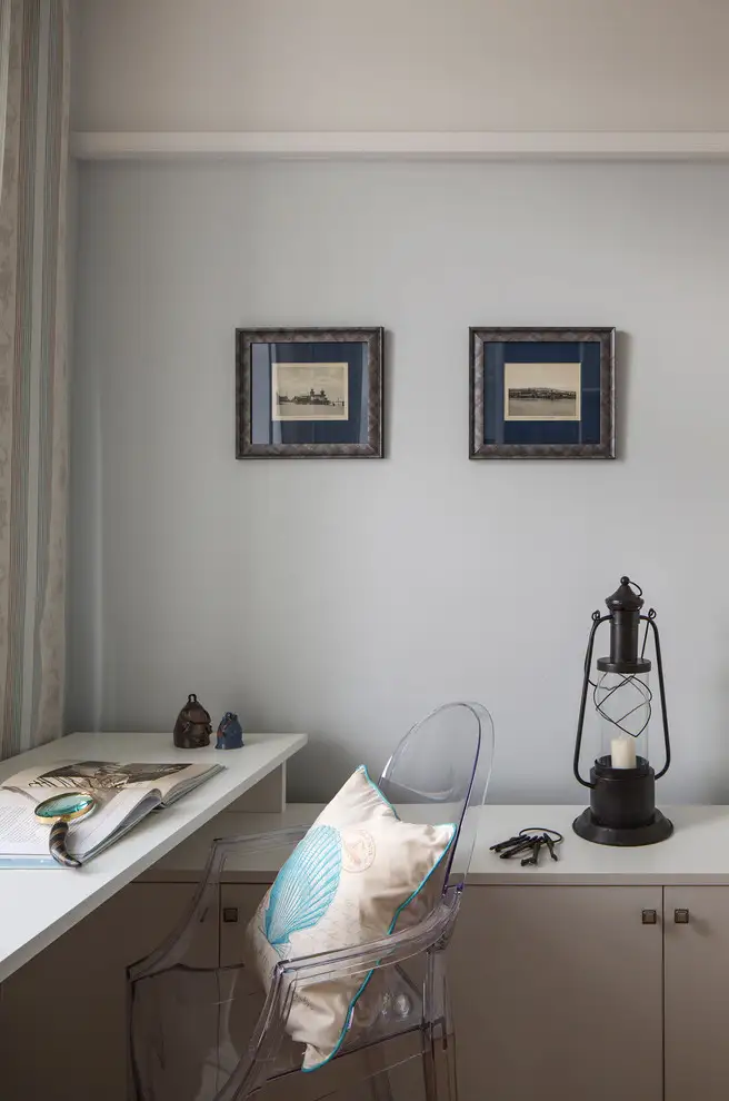 Incaperea din stanga livingului, ceea ce ar fi putut fi un spatiu pentru birou, a fost amenajat ca o camera de oaspeti. Canapeaua intr-un bleu-ciel este punctul de atractie al incaperii, iar decoratiunile sugereaza din nou motivul marinaresc.