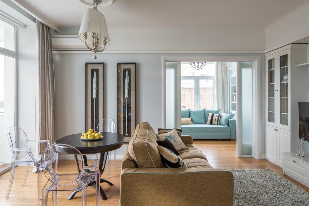 Trecerea inspre living se face printr-un dining amenajat discret. Scaunele tip Ghost (din plexiglass transparent) sunt o alaturare cel putin interesanta, in contextul decorului. Resimtim o usoara inspiratie clasica in elementele care compun livingul, dar toate intr-o interpretare contemporana. Eclectismul acestui dining este de admirat. Simetria defineste asezarea pieselor de mobilier.