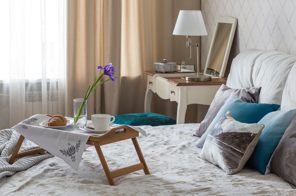 Designul mobilierului si decoratiunile ne inspira un aer romantic, nostalgic, iar modelul discret al tapetului armonizeaza elementele ce compun aceasta amenajare a dormitorului.