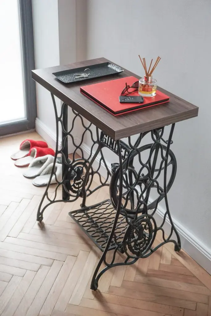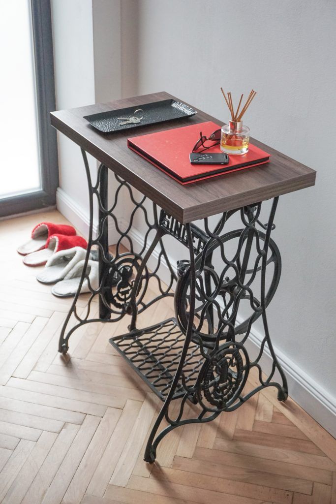 Cada de fonta gasita in apartament la cumpararea acestuia a fost reconditionata si transformata intr-o piesa centrala a baii; consola din holul de acces are picioarele de la masina de cusut Singer a bunicii.; soba a fost pastrata doar la nivel conceptual si ca pozitie in camera, fiind inlocuita cu un semineu modern cu accente metalice.
