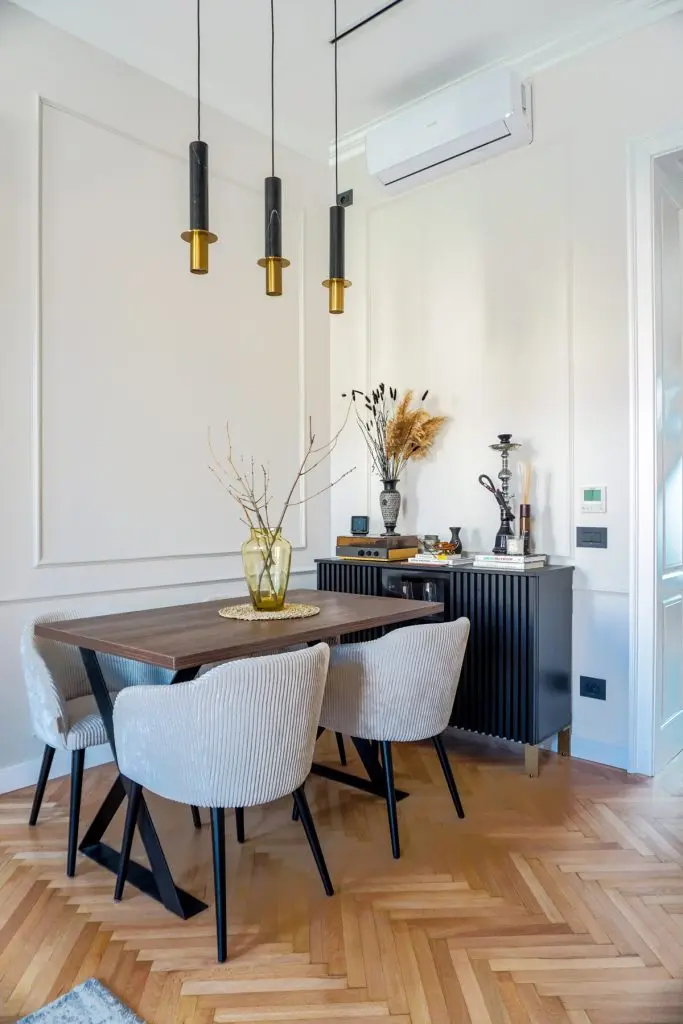 In zona de dining au folosit 3 lustre pendul cu lumina dimabila si concentrata pe zona de luat masa