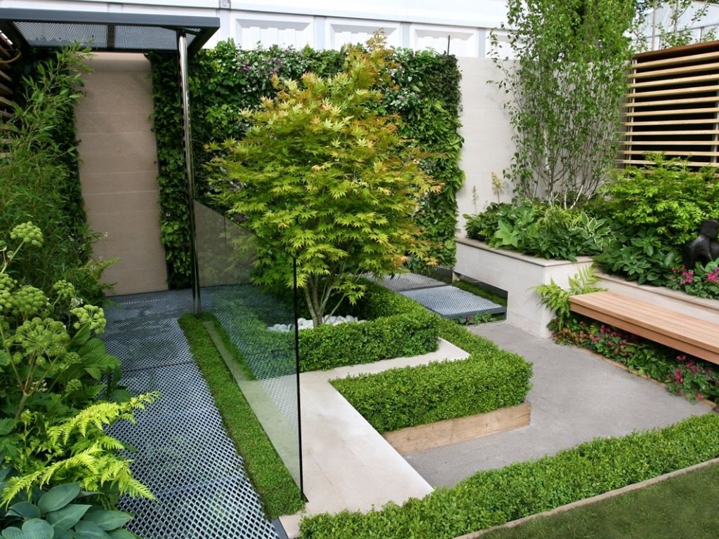 arbustii se tund in forme geometrice. Chiparosul albastru, Hibiscusul sau Lemnul cainesc sunt cateva exemple de arbusti care pot fi integrati intr-un astfel de spatiu